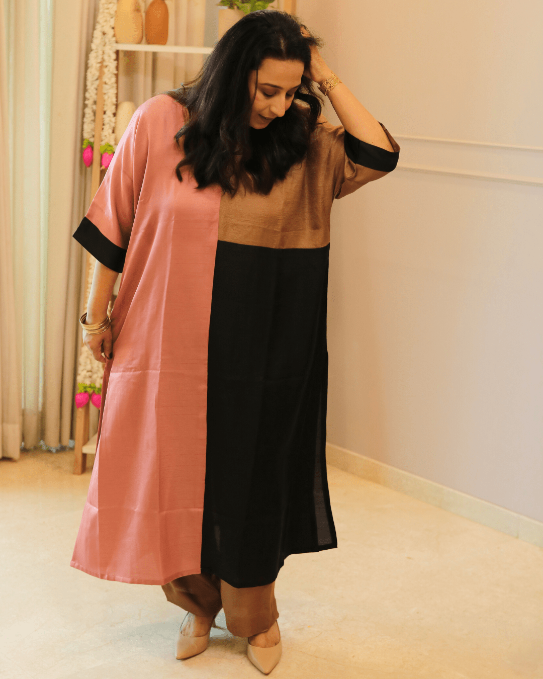 Elevate your everyday wardrobe with this refined pink ensemble. The keyhole V-neck top features elegant 3/4 sleeves and a slip-on design, while a practical side pocket adds functionality. Paired with mid-rise, straight-fit pants in a flattering A-line silhouette, this set combines comfort with understated sophistication. The full elasticated waistband ensures ease of movement, making it an effortless choice for both casual outings and relaxed professional settings.