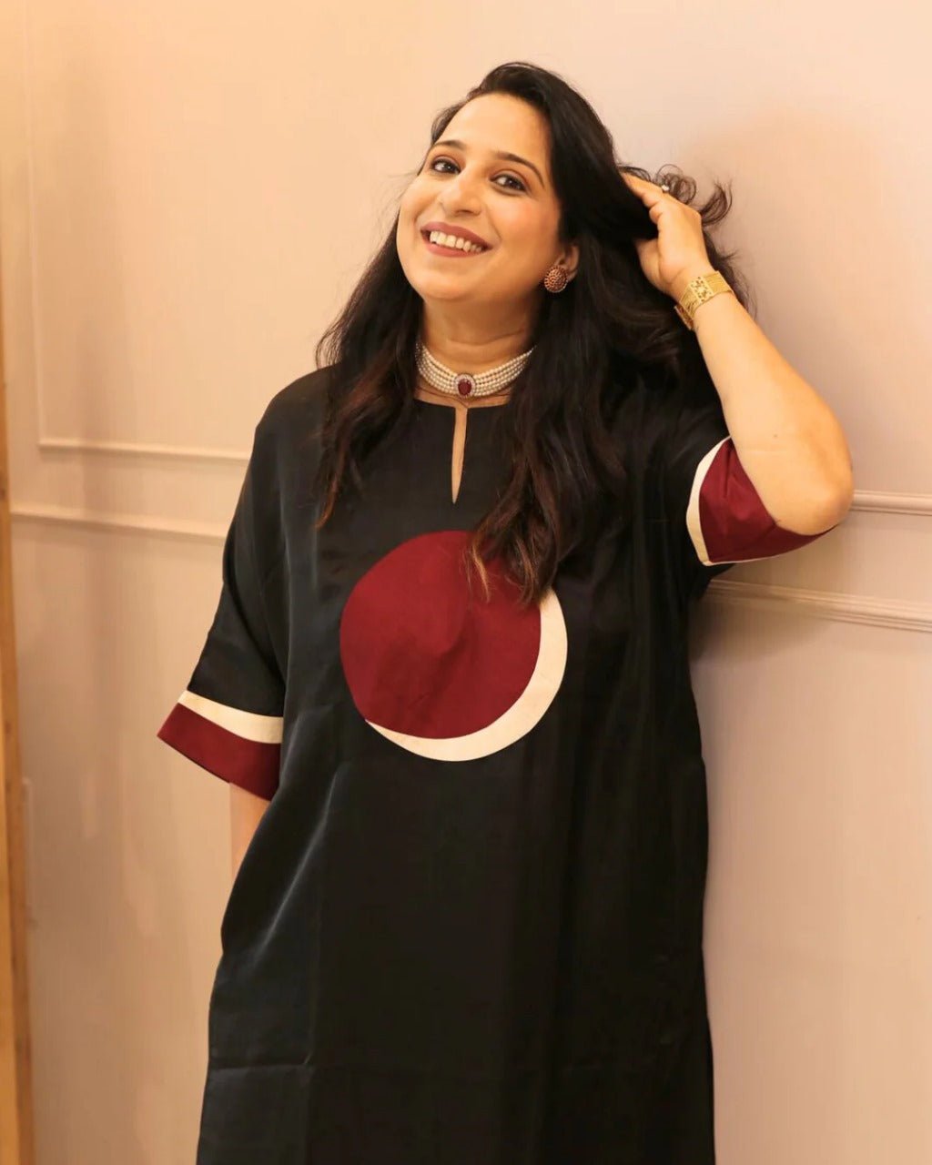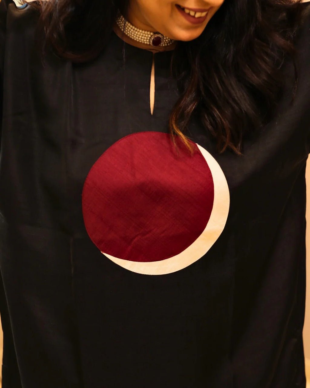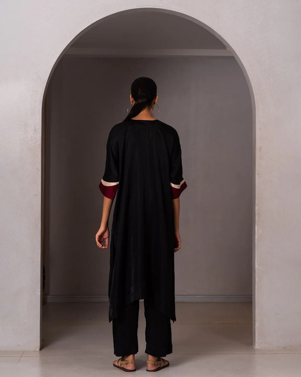 Embrace timeless sophistication with this striking black silk ensemble. The keyhole V-neck tunic features elegant 3/4 sleeves and a slip-on silhouette, while a practical side pocket enhances functionality. Paired with mid-rise pants in a flattering A-line cut, the straight fit and full elasticated waistband provide effortless comfort throughout the day. Rendered in luxurious silk, this versatile set serves as a wardrobe essential—equally at home in professional settings or refined casual occasions.