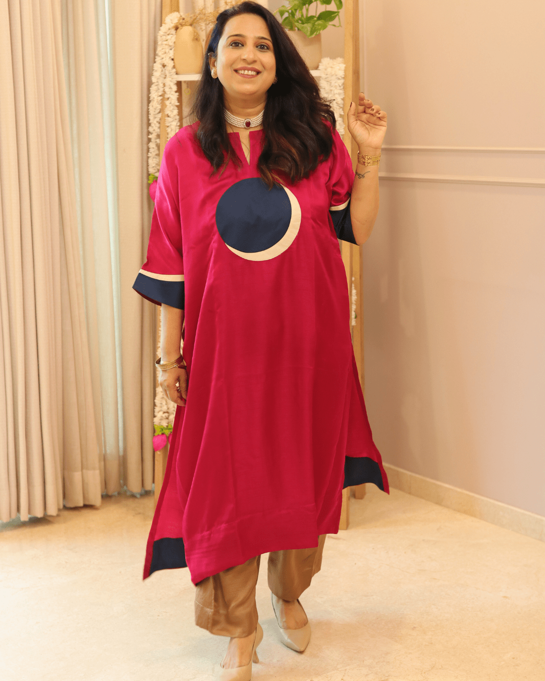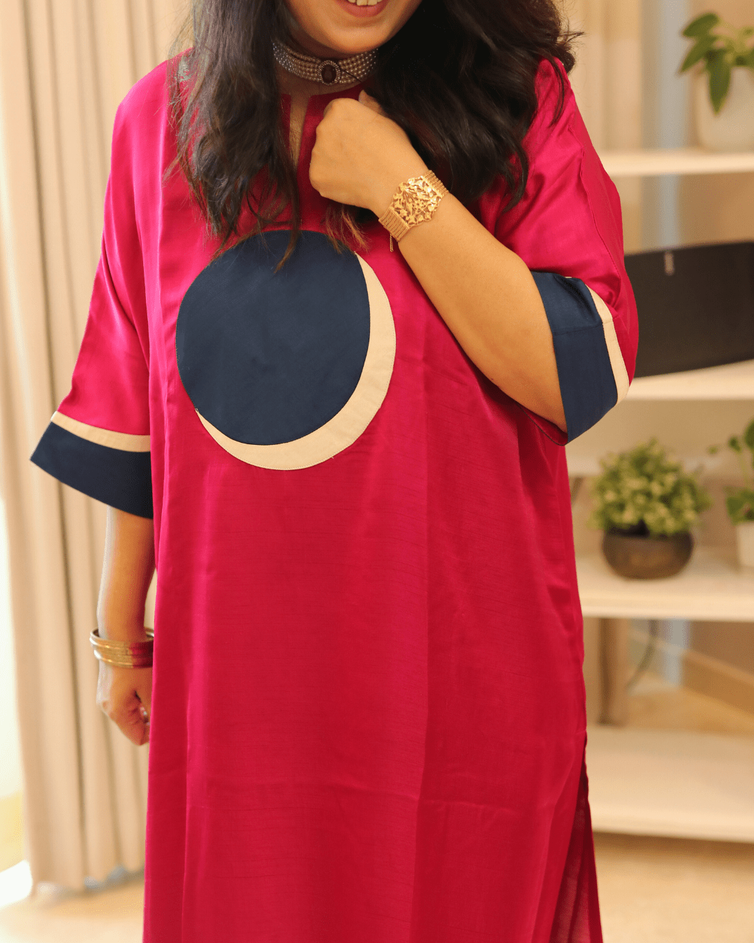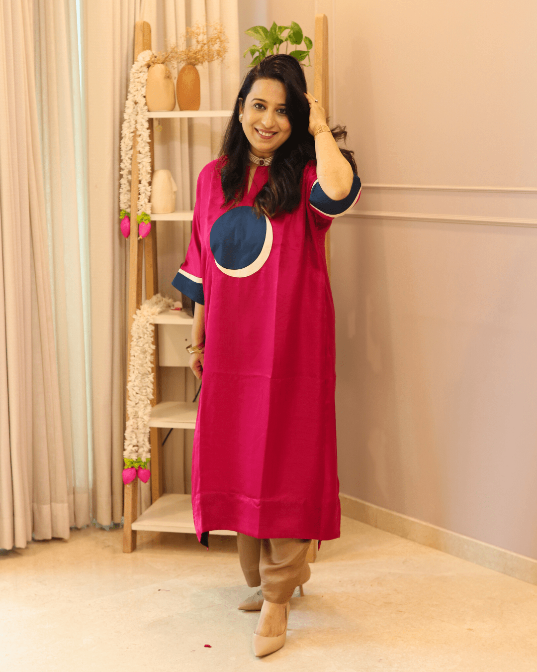 Experience understated luxury with this exquisite dark pink silk collection. The keyhole V-neck top presents a subtle design detail, paired with graceful 3/4 sleeves and effortless slip-on styling. A functional side pocket adds practical elegance. The accompanying mid-rise pants feature a refined A-line silhouette with a straight fit and full elasticated waistband for optimal comfort. Crafted from premium silk, this curated set embodies modern sophistication, perfect for those who appreciate quality and timeless style.