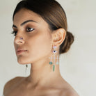 This lovely pair of statement earrings is inspired by the Bageecha ki Pichwai, whose elements it deconstructs and takes forward as jewellery. Accordingly, it features lots of hand carved green gemstones, including a green quartz banana leaf, fluorite and emerald lotus leaves, and a silver peacock feather with an emerald in the centre. The entire piece is embellished with seed pearls and set in silver. Shreenathji's presence in this vignette is symbolized through a traditional enamelled Netra. Don't miss the eyelid detail which is a unique setting we developed. The earrings are very light weight and move beautifully.