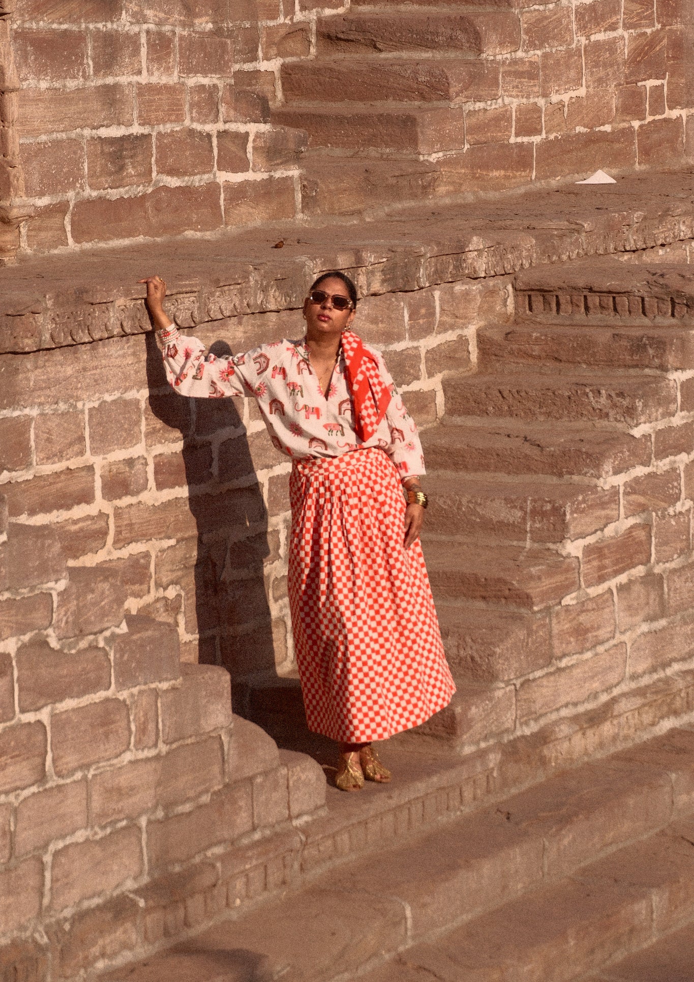 Crafted from soft cotton, the Bawari Skirt features a hand block-printed checkered design in azo-free colors. Designed with elegant pleats, it offers a structured yet flowy silhouette that moves beautifully with every step. With its comfortable, adjustable waist and timeless charm, this skirt is perfect for effortless, all-day wear. Style it with a tucked-in blouse or pair it with your favorite top for a versatile, chic look.