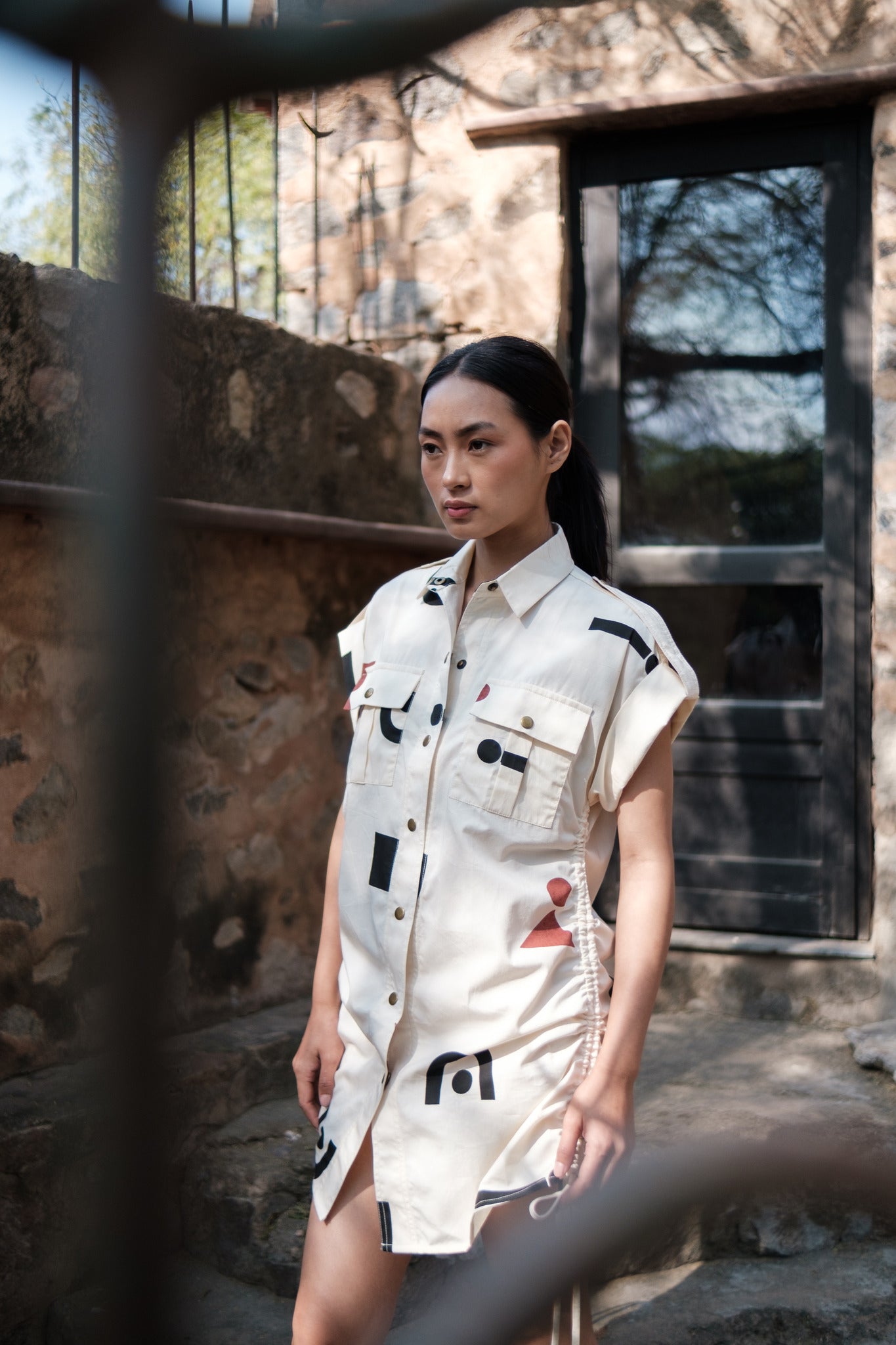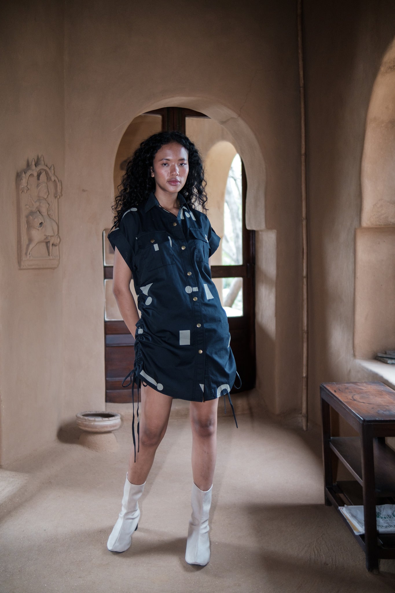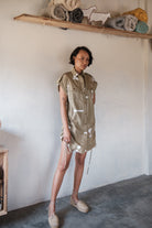 - Dress has regular collar and metal press button down detailing in the front