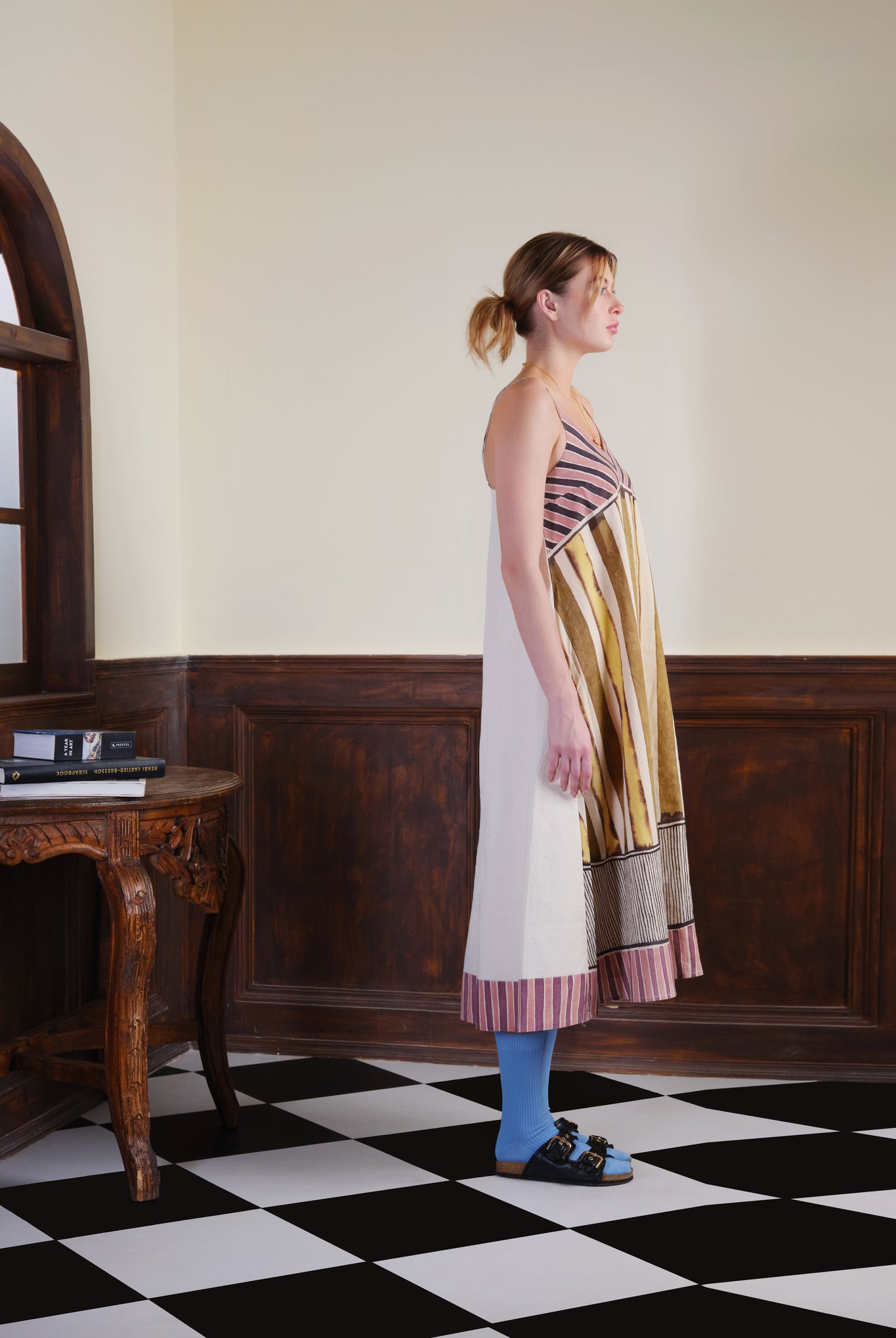This Earth Smells Like Rain Vest combines artisanal hand painting with a refined structure. Crafted from 100% cotton, it features a semi-boat neck and indigo blue fabric, enhanced by front panels painted with natural dyes like myrobalan, lac, and alum, and a back painted with kassim. The brass button closure adds a subtle, elegant touch, making this vest a distinctive piece that blends traditional craftsmanship with a sophisticated silhouette.