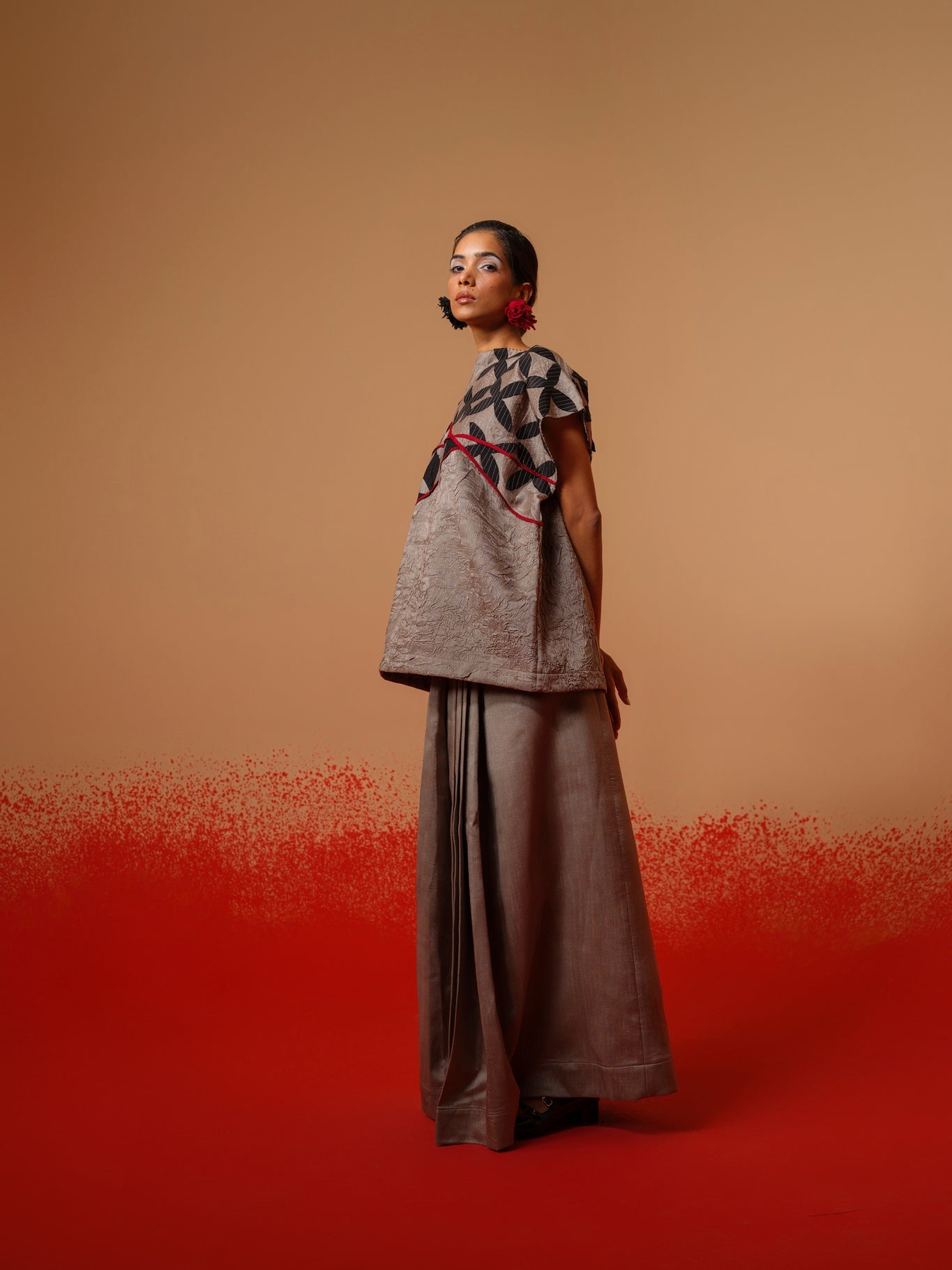 - Top has overlap V-neck, half sleeves and inverted pleat detailing in the front