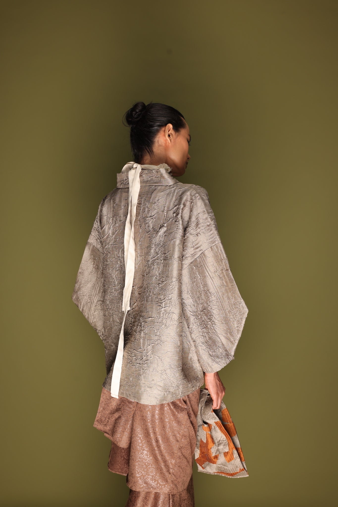 Soft, elegantly shaped, and subtly eye-catching. This relaxed silhouette top is made from our signature crushed silk, featuring distinctive sleeves and a highlighted neckline — seamlessly blending comfort with refined drama.