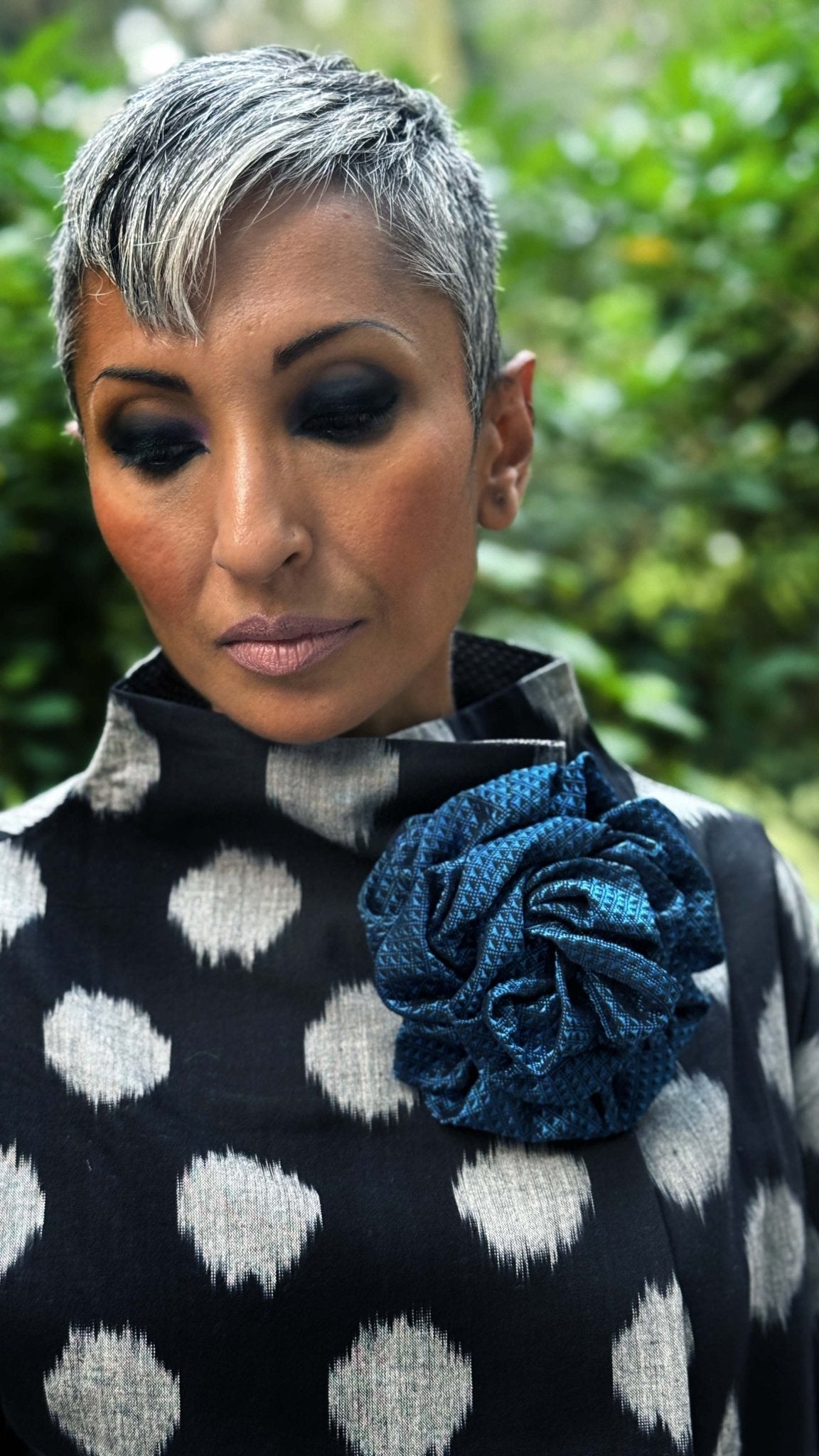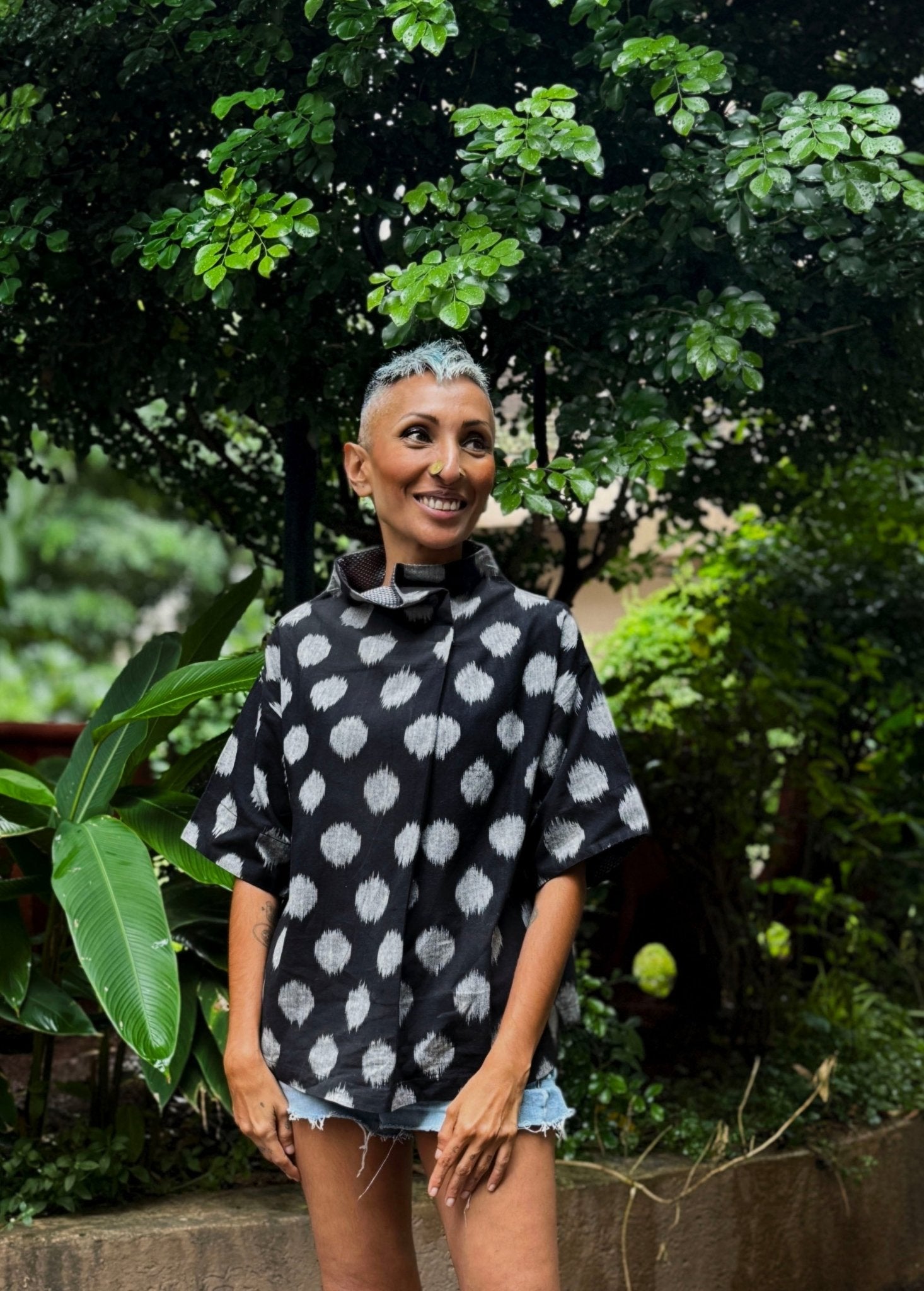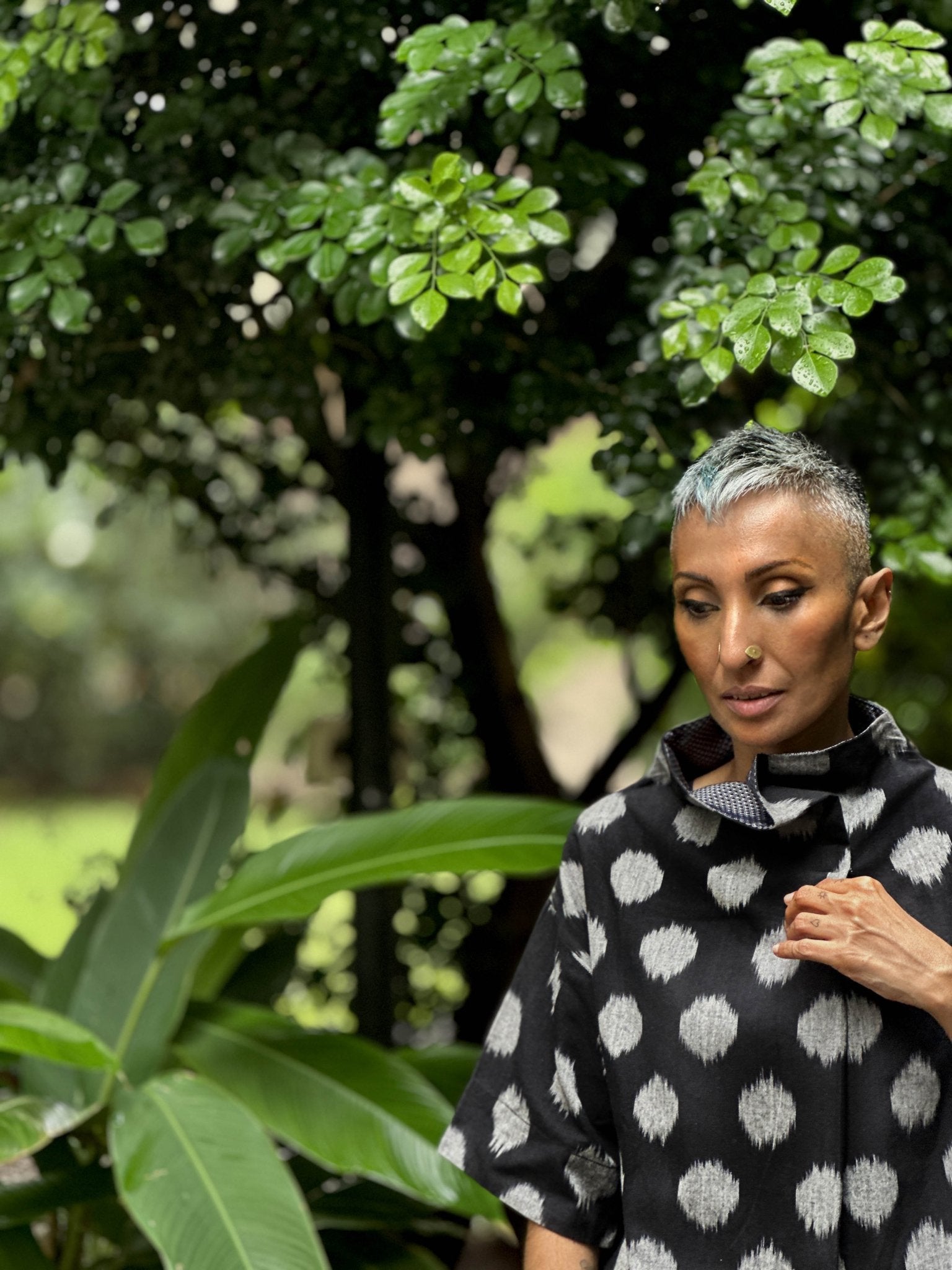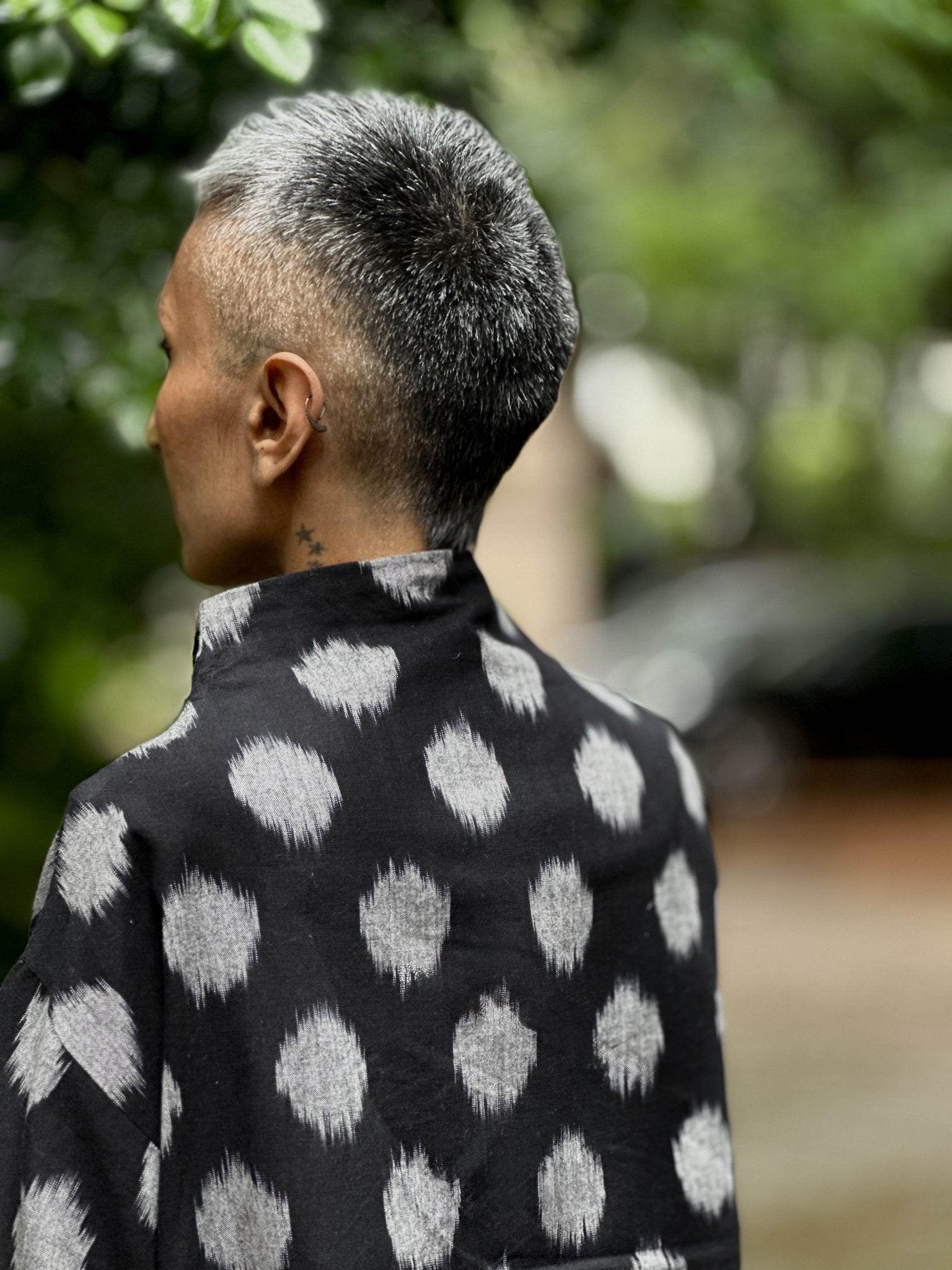 The Big Hug Top redefines versatility with understated elegance. This gender-neutral oversize silhouette transitions effortlessly from relaxed workdays to refined evenings, crafted in handwoven ikat cotton with a striking graphic polka pattern. Refined khun detailing adorns the mock neck collar and pockets, while a soft front pleat introduces subtle dimension and ease of movement. A thoughtfully designed piece that celebrates artisanal textile work and timeless, inclusive style.