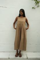 The Cha Dress combines understated elegance with thoughtful craftsmanship. Cut from naturally dyed, self-checkered cotton, this gathered silhouette drapes with effortless grace. Selvedge detailing at the hem adds an artisanal touch, while practical side pockets and a discreet back button closure balance form with function. A refined everyday piece that celebrates quality materials and considered design.