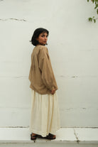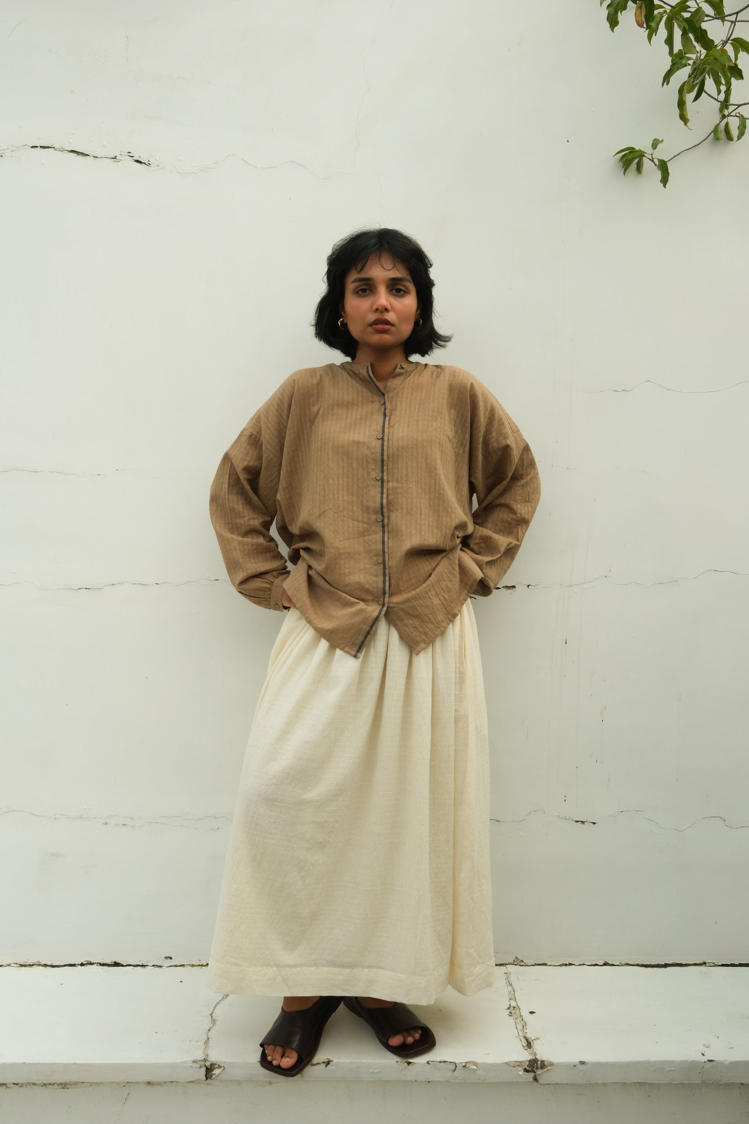 Cha Oversized Shirt Crafted from lightweight, naturally dyed cotton in a traditional chatai weave - a technique refined by Bengal's master weavers, this oversized shirt balances artisanal heritage with contemporary ease. The self-checkered pattern emerges organically through the weaving process, while visible selvedge detailing on the front signals authentic construction. Refined slim collar proportions and practical side slits complete a silhouette that moves between relaxed and intentional.