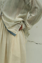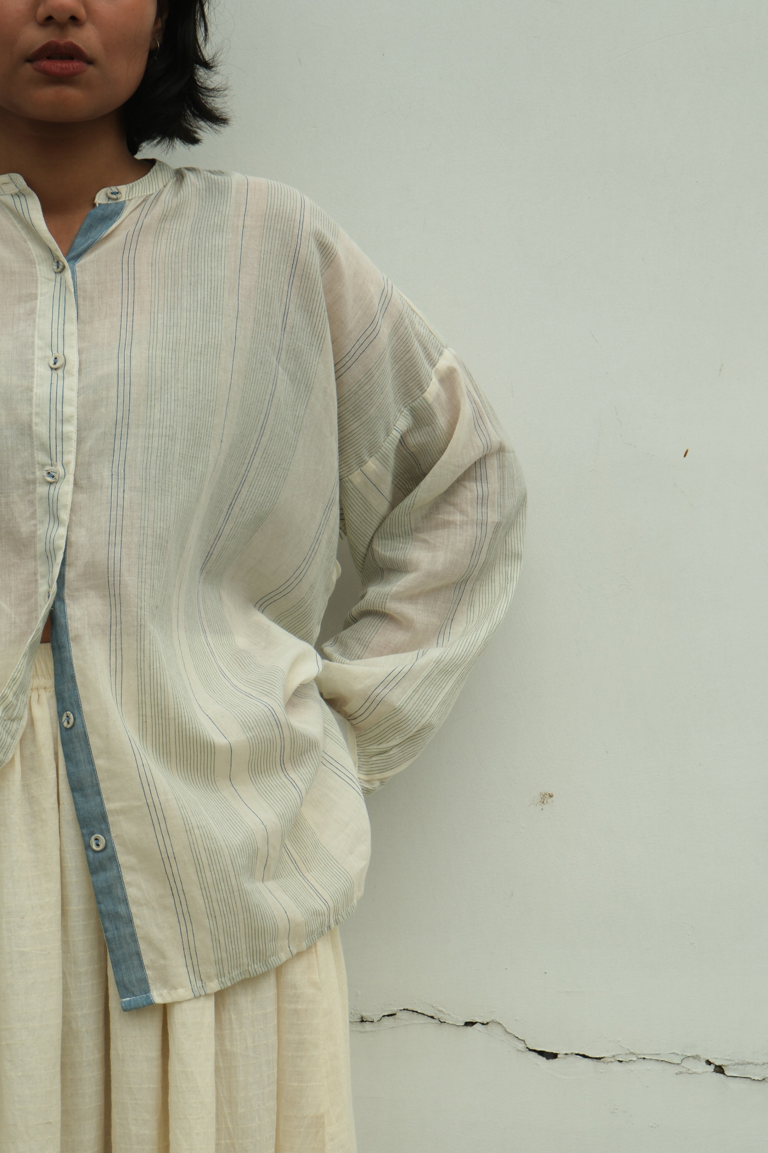 Subtle indigo and green stripes, naturally dyed and woven into crisp cotton from West Bengal, strike an elegant balance between understated and visually engaging. This oversized shirt embraces relaxed sophistication with a selvedge finish, side slits, a structured box pleat, and a refined band collar. Perfect for layering or wearing solo, it's a versatile piece that bridges casual comfort with considered design.