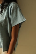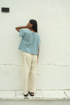 Sky blue and cloud white threads interlace across a mid-weight cotton weave, creating subtle texture and natural structure. This Kimono Sleeve Box Top features a gracefully wide neckline that balances its relaxed silhouette. Crafted with azo-free yarn dyes, the fabric combines understated elegance with responsible production, a refined piece that transitions effortlessly from day to evening wear.