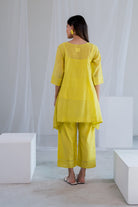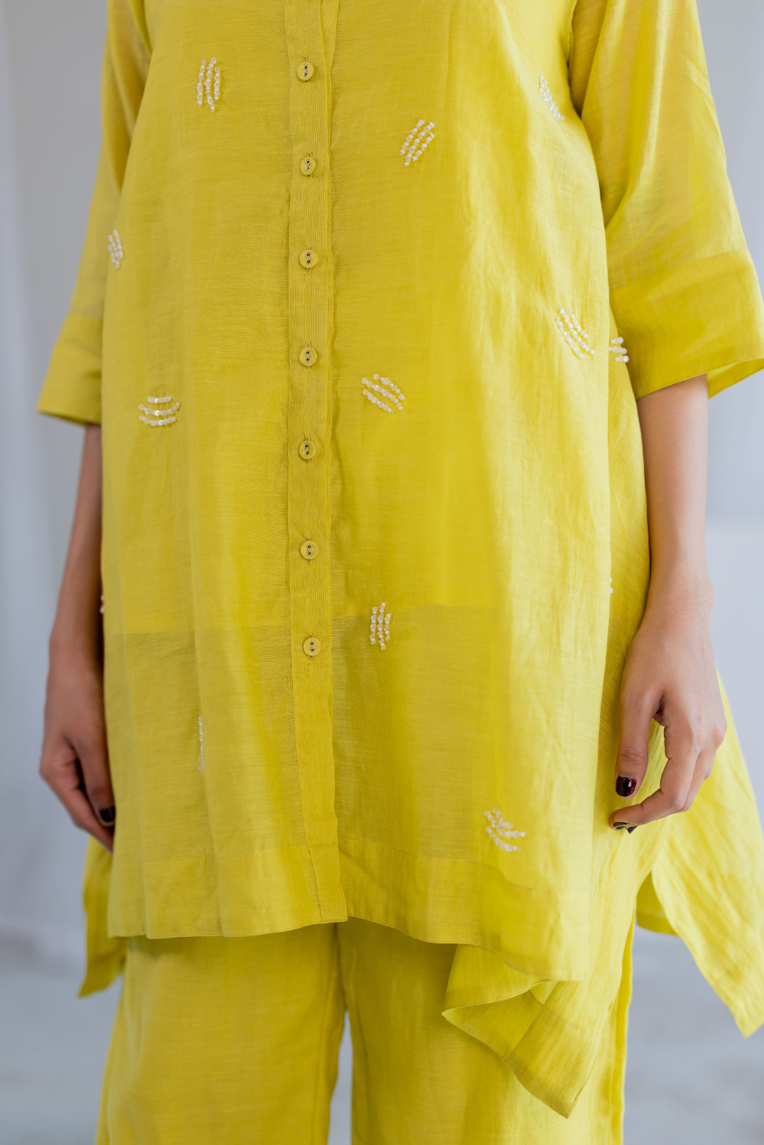 Elevate your style with this lime Chanderi asymmetric tunic, featuring delicate white bead embroidery for a subtle, elegant look. The breezy fabric and contemporary cut make it perfect for festive occasions or chic casual wear. It can be styled in different ways—pair it with pants, leggings, or even skirts for versatile, fashionable looks.