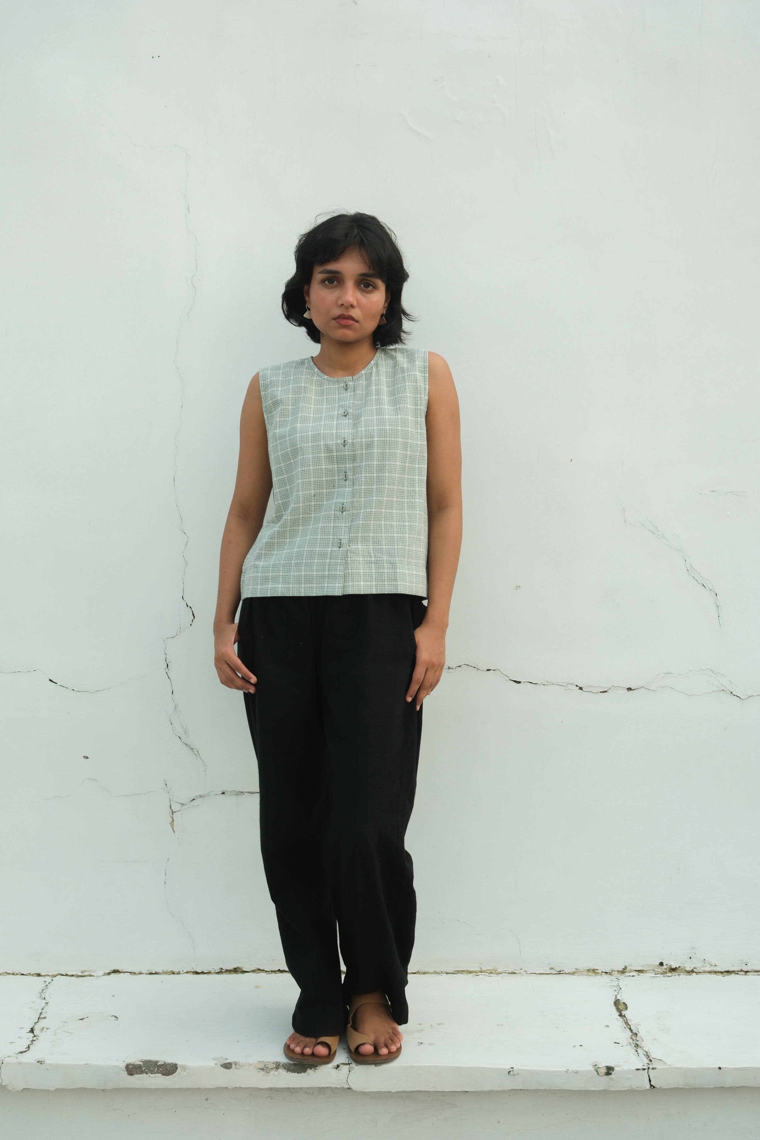 A refined layering essential, this checkered vest is crafted from mid-weight naturally dyed cotton that develops character with wear. Clean front button closure and a structured silhouette make it an ideal companion to your everyday wardrobe, equally at home over a crisp shirt or lightweight sweater. The textile's organic dye palette ensures each piece carries subtle variations, adding depth and authenticity to your styling options.