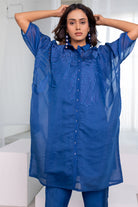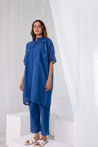 Add effortless charm to your summer wardrobe with this Blue Chanderi Tunic Set. The tunic showcases intricate leaf appliqué work on the centre panel, paired with matching pants for a complete, polished look. A playful polka dot inner slip ensures comfort and modesty while adding a subtle layer of style. Perfect for casual gatherings, brunches, or easy festive dressing, this set combines elegance with breathable comfort.