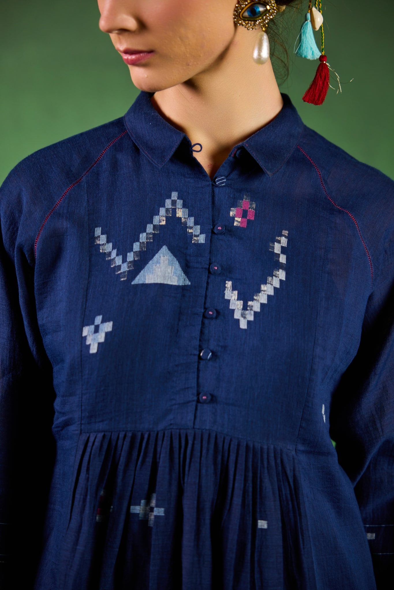 Elevate your wardrobe with the Trisha Dress, a sophisticated piece crafted from luxurious silk cotton. This above-knee length design features a refined deep indigo hue with an exquisite collared neckline. The garment showcases intricate geometric Jamdani motifs and delicate zari stripes throughout, while fagotting details on the front panels add artisanal charm. Selvedge placement adorns the cuffs, and fabric buttons complete this thoughtfully designed dress—perfect for occasions demanding understated elegance and timeless appeal.