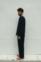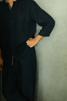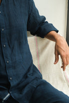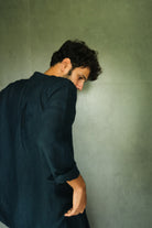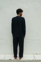 This men's shirt commands attention with its rich, deep blue palette, thoughtfully interrupted by a subtle selvedge accent that adds visual intrigue. The slim band collar and back box pleat create a tailored silhouette, while azo-free yarn dyeing ensures both colour integrity and responsible craftsmanship. A refined piece for the discerning wearer who values both aesthetics and ethical production.