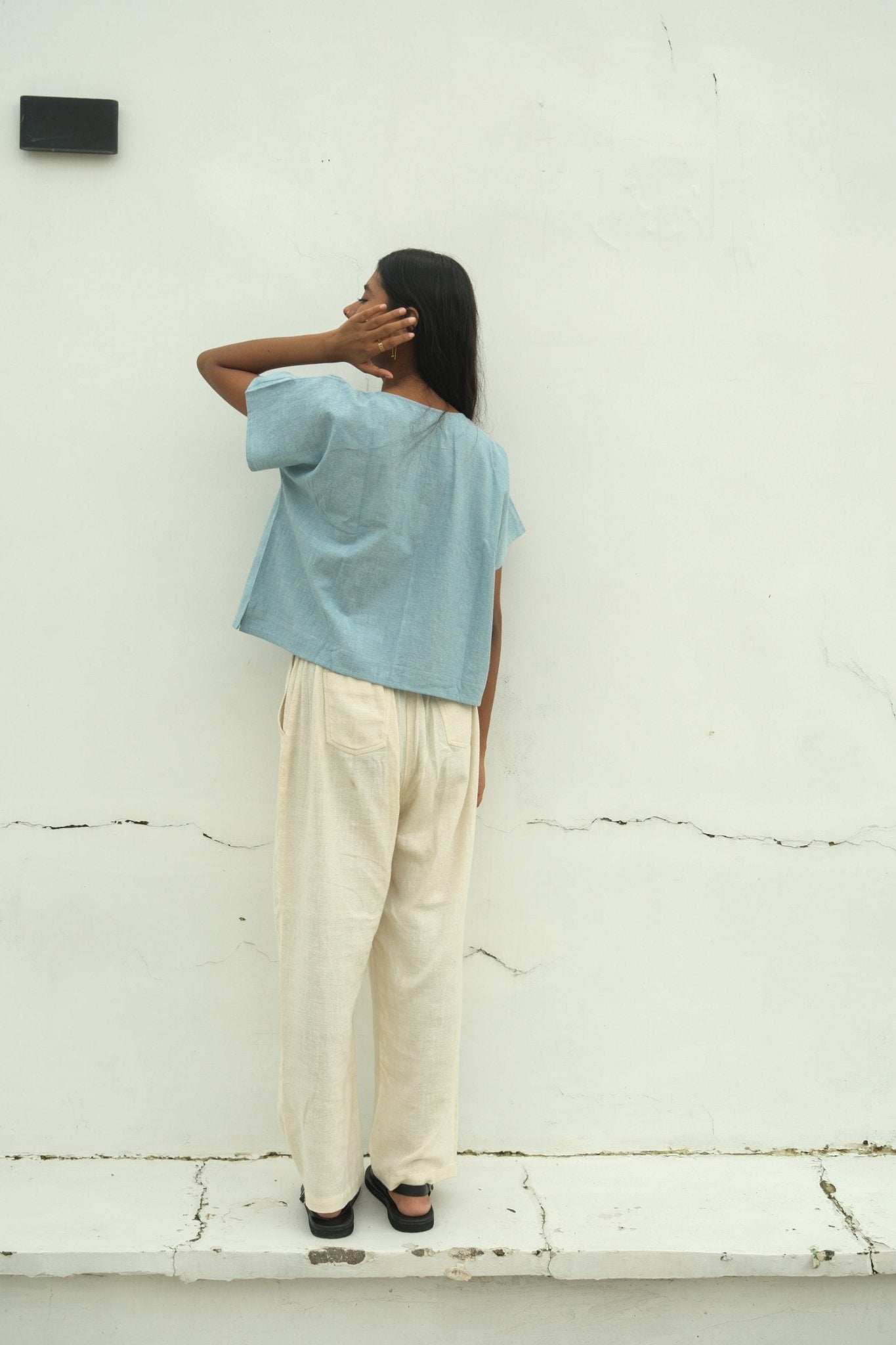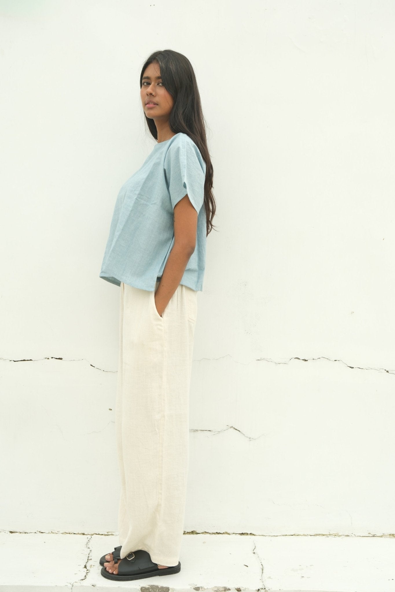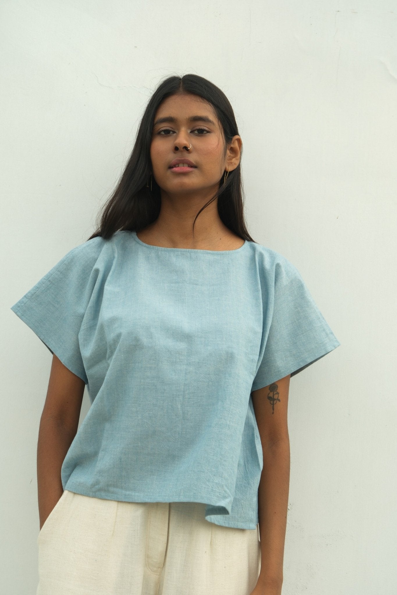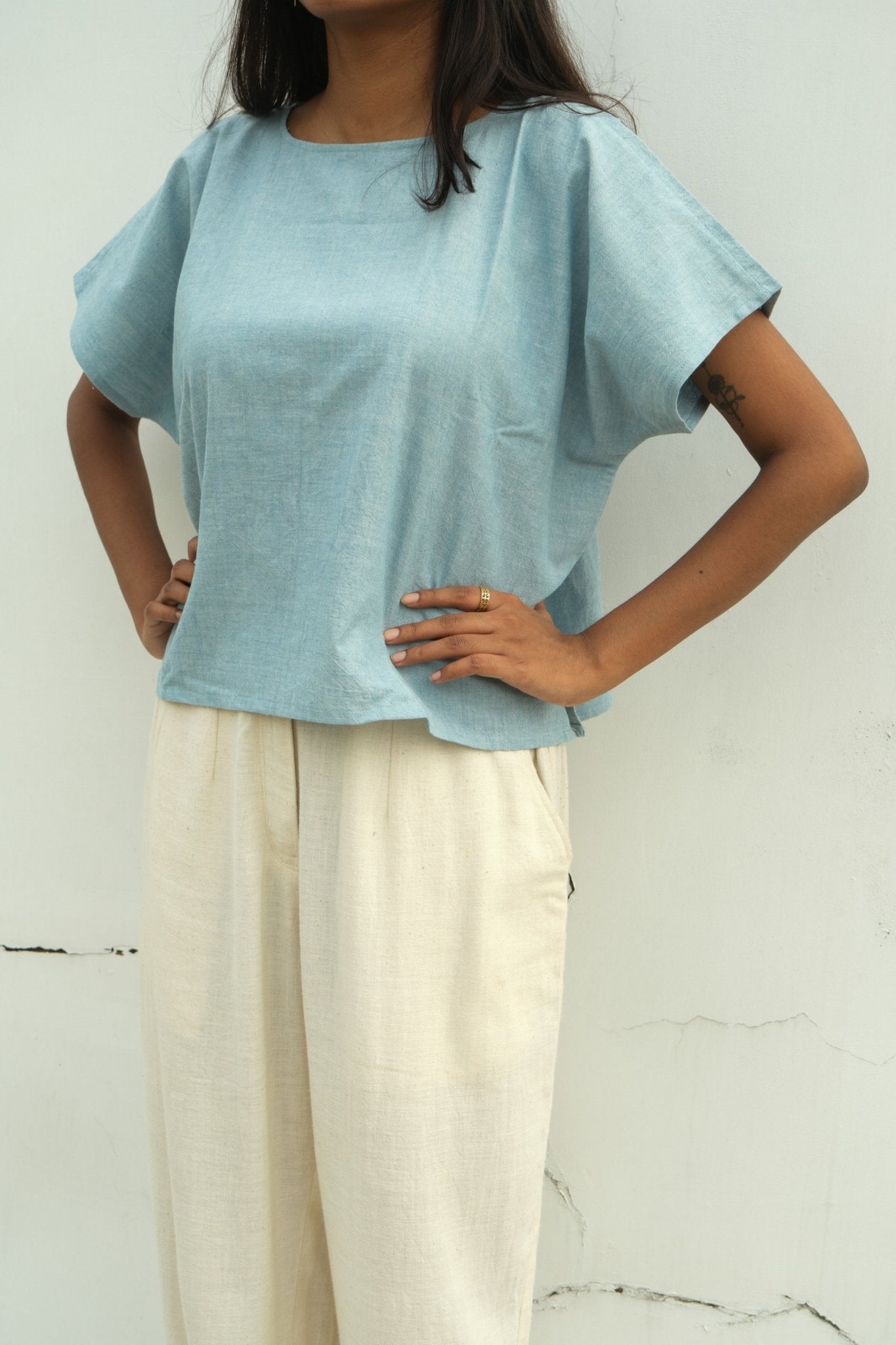 Sky blue and cloud white threads interlace across a mid-weight cotton weave, creating subtle texture and natural structure. This Kimono Sleeve Box Top features a gracefully wide neckline that balances its relaxed silhouette. Crafted with azo-free yarn dyes, the fabric combines understated elegance with responsible production, a refined piece that transitions effortlessly from day to evening wear.