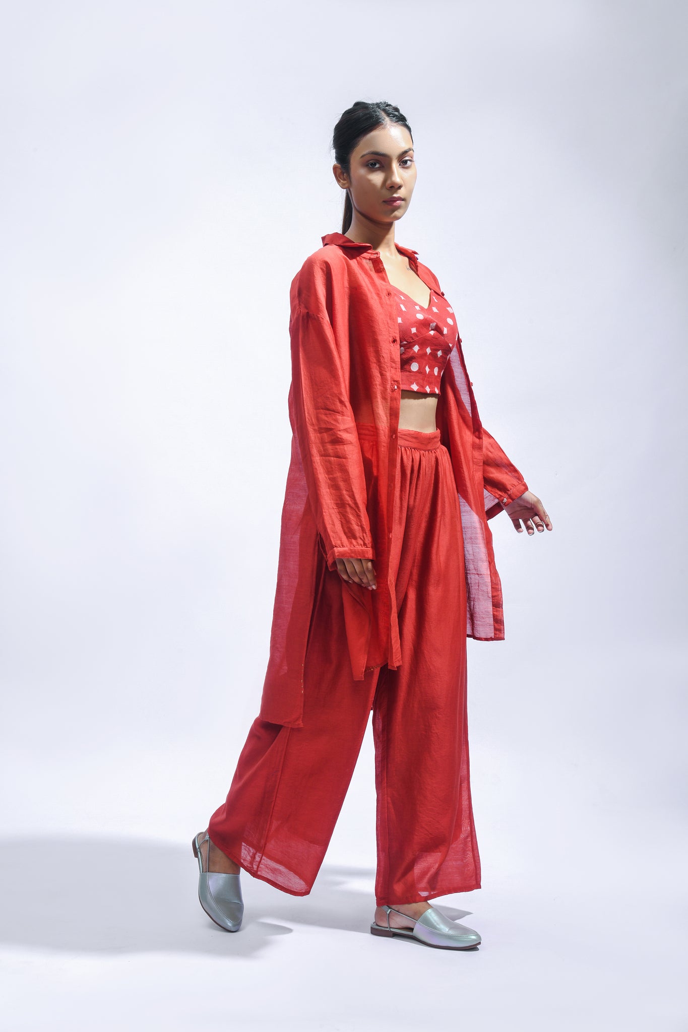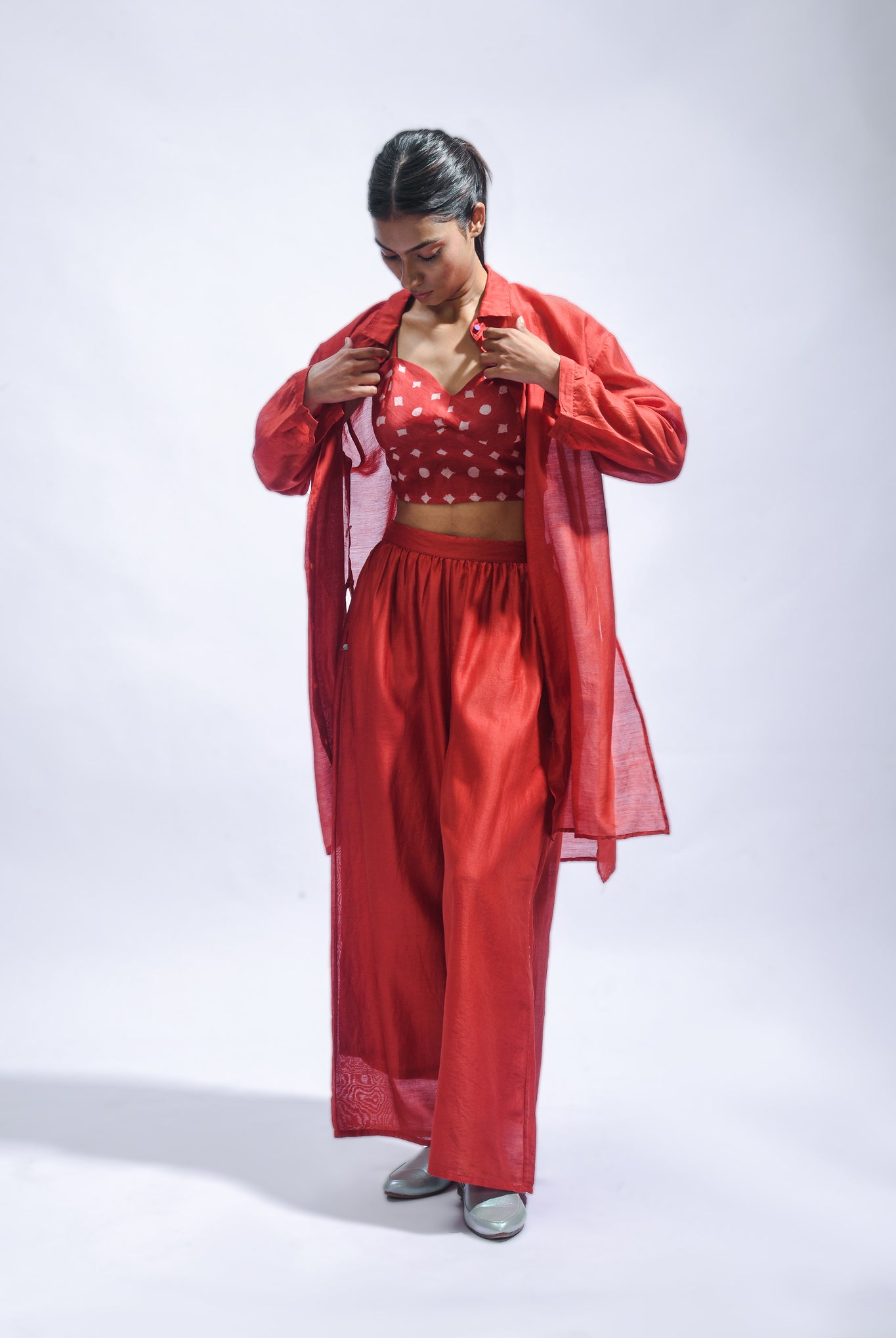 The modern busy life is all about convenience and ease, and co-ord Sets for women are those put-together outfits that make dressing every day a cakewalk. Our curation of Ciceroni goes a step forward as our selection is thoughtful and we do the due diligence about design and textile for you. So, while you may hastily put together the outfit, it will always look stylish and effortless. Co-ord Sets are a time-tested option for any occasion as they can transition from work to play with a little tuck-in or an eye-catching accessory. Our Co-ord Sets are utilitarian yet dressy, comfortable yet stylish, and modern yet timeless. They are the best trans-seasonal ‘fits as they can be layered, re-worn, or worn as separates…the options are endless. Our interesting picks will build character to your ensemble - look for little details like tie-ups, flared pants, fringes, alluring drapes, corsets, feminine cut to shorts and Bermudas, strappy bralette designs, embroidery, and woven Zari stripes, checks, and delicate motifs. Our contemporary version of these matching sets makes for easy-going and travel glam looks, geeky lounge fits, smart and sharp fits, breezy holiday feels or afternoons-spent-doing-nothing vibes. Luxurious textiles like Mashru Silk, handwoven indigenous Cotton weaves, Jamdani Cotton and Silk, Bemberg Cotton Satin, Linen, Chanderi and Hemp give way to versatile styles. The retro-esque renditions like pant suits, Bermuda co-ords, jacket co-ords, skirt co-ords, tunic co-ords, shirt co-ords, and kaftan co-ords feel too irresistible to not wear every other day. We reckon every Co-ord can also be worn as separates, hence increasing the wearability of your capsule wardrobe – whether they be printed, solids or colour blocked in summery bright colours, neutrals, pastels, ombre combinations and so on.