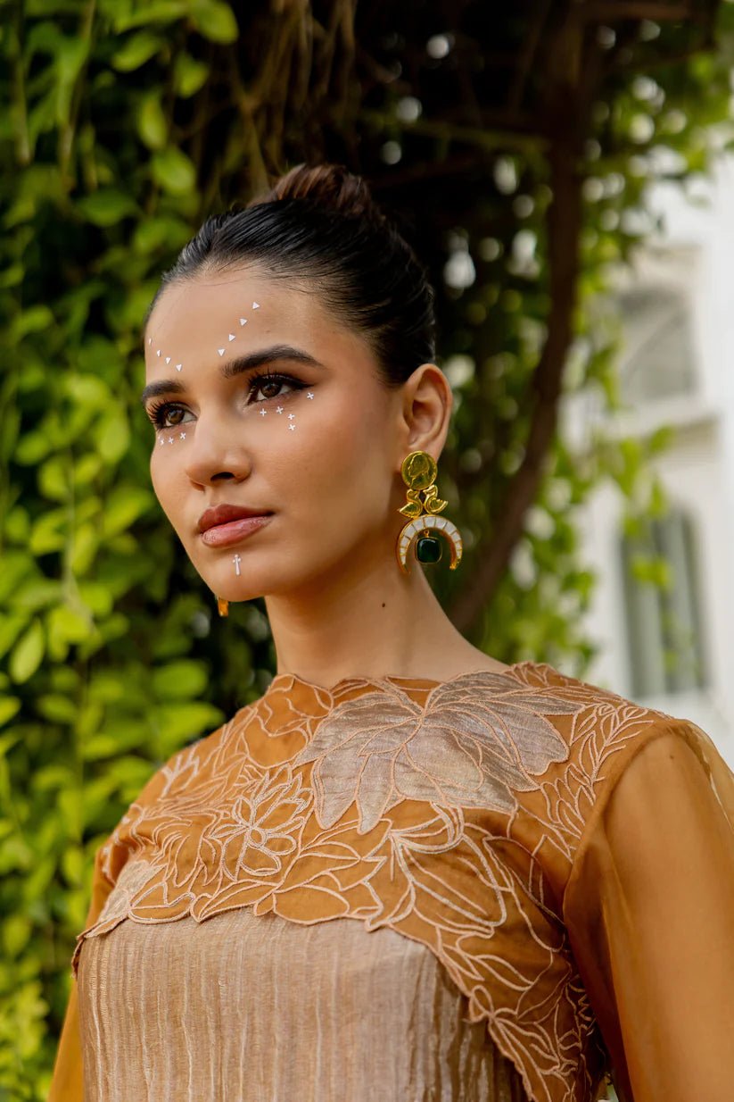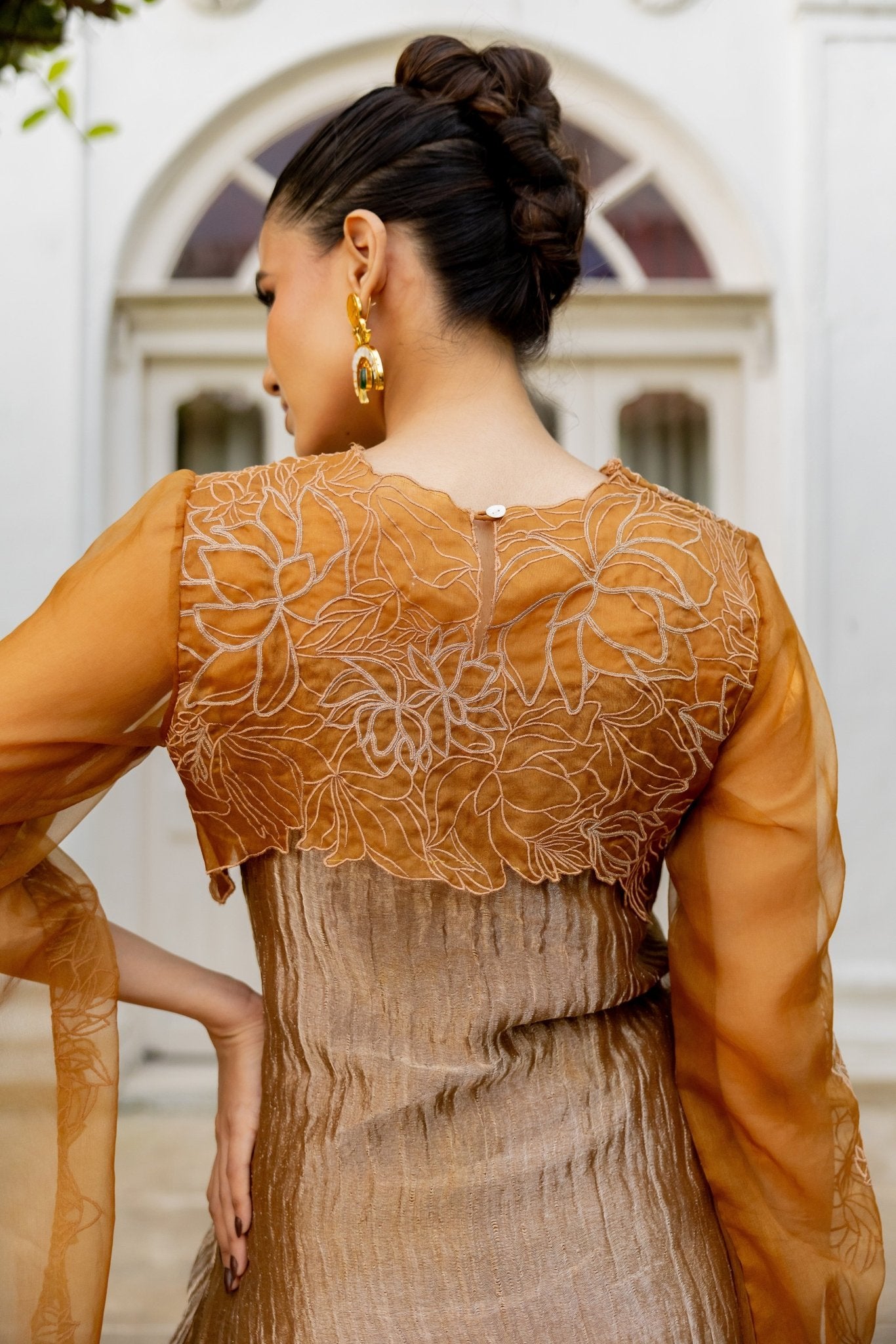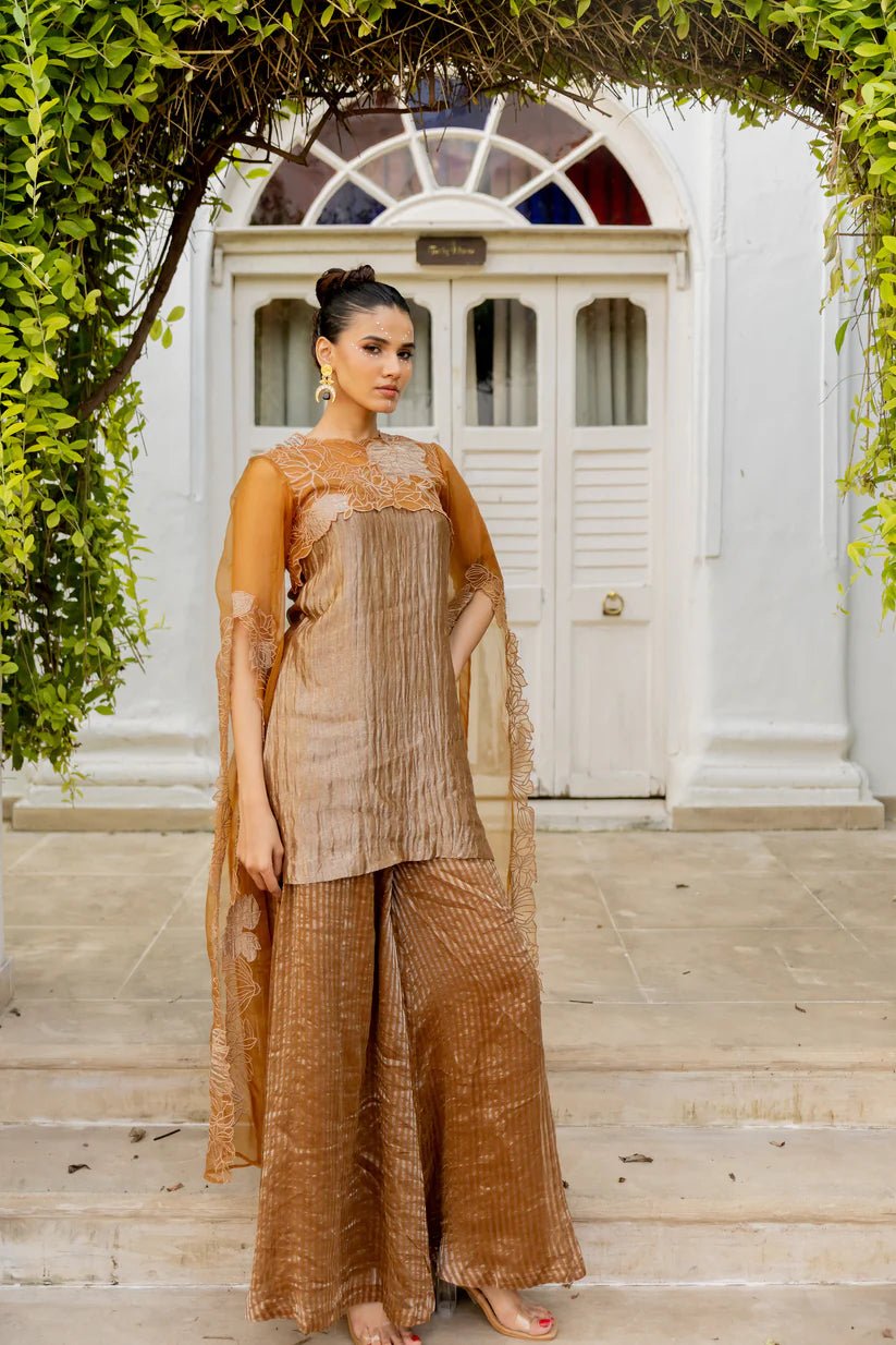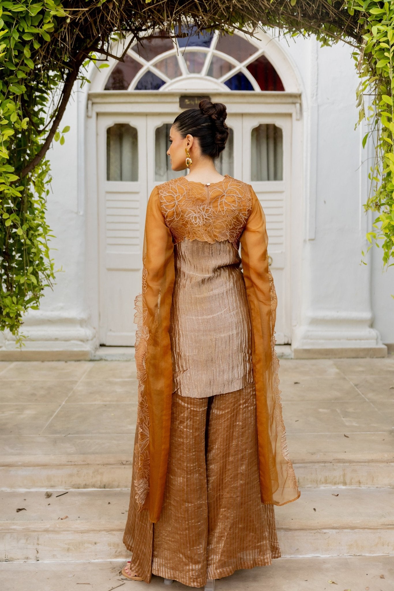 The Akira Set is a three-piece ensemble in warm brown. The silk overlay features patchwork with resham embroidery and dramatic slit sleeves in a relaxed fit. A sleeveless top with noodle straps and round neckline pairs with high-waisted sharara pants in a flared silhouette. Crafted from premium Banarasi and Chanderi silk tissues with cotton silk lining for timeless elegance.