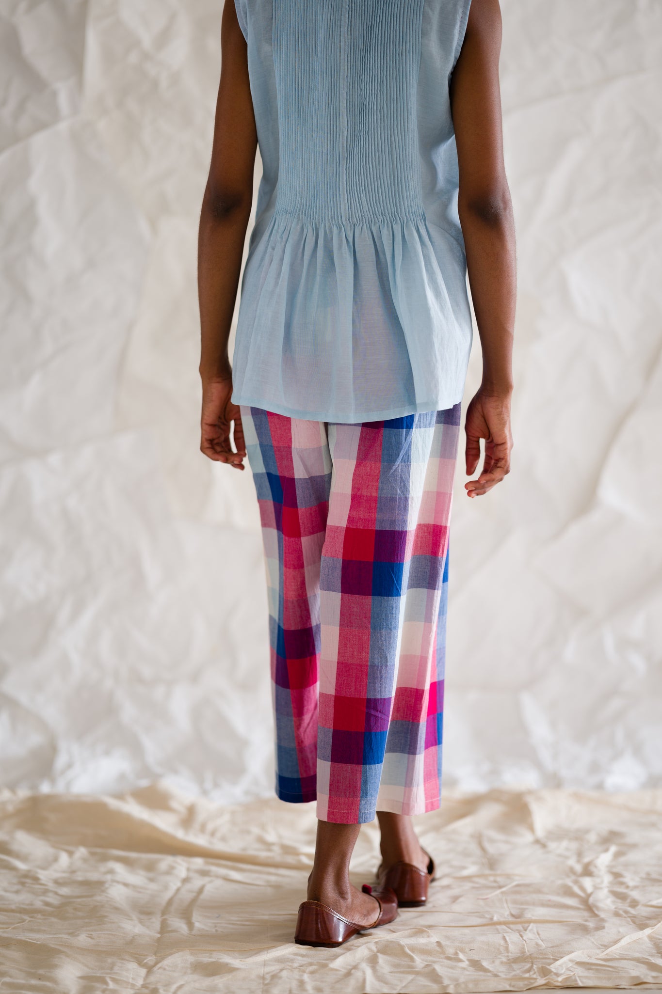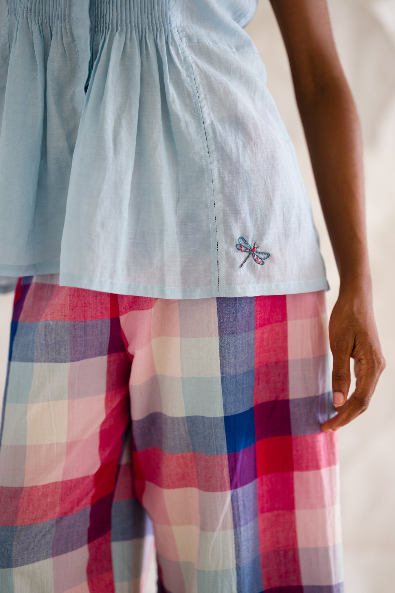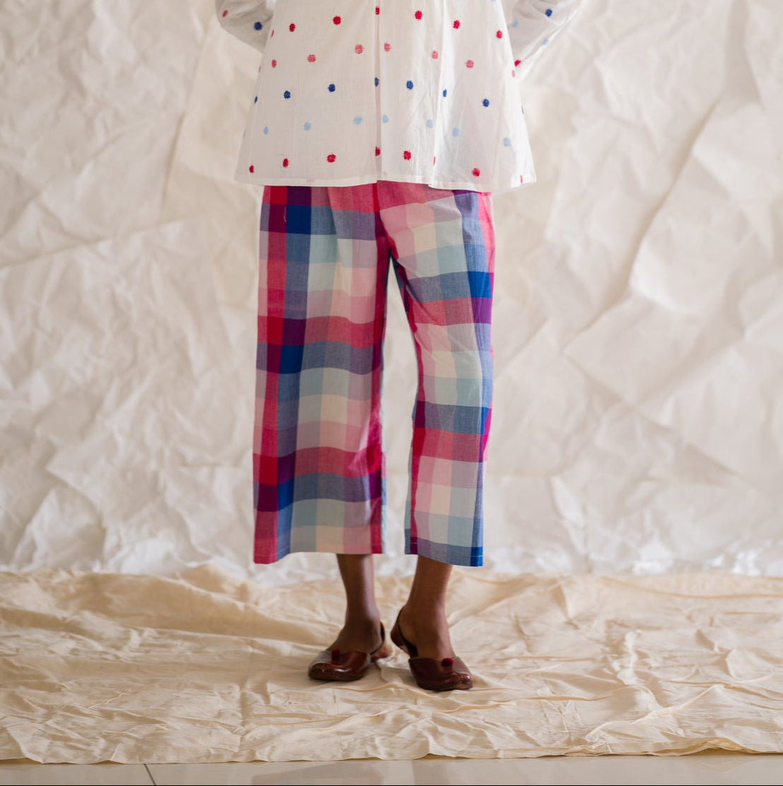 Elevate your style with our Moonlight Co-ord Set. Crafted from handwoven cotton checks, this chic set features delicate pleats on the yoke and back, adorned with exquisite hand embroidery and crochet details. Perfect for a sophisticated and exclusive look.