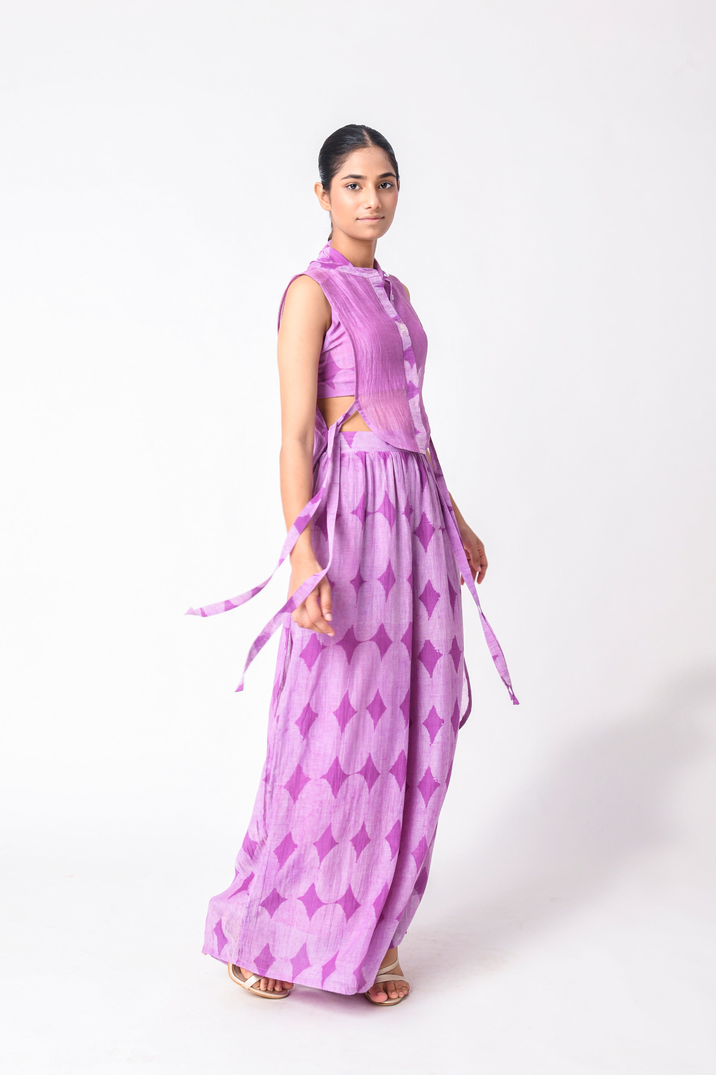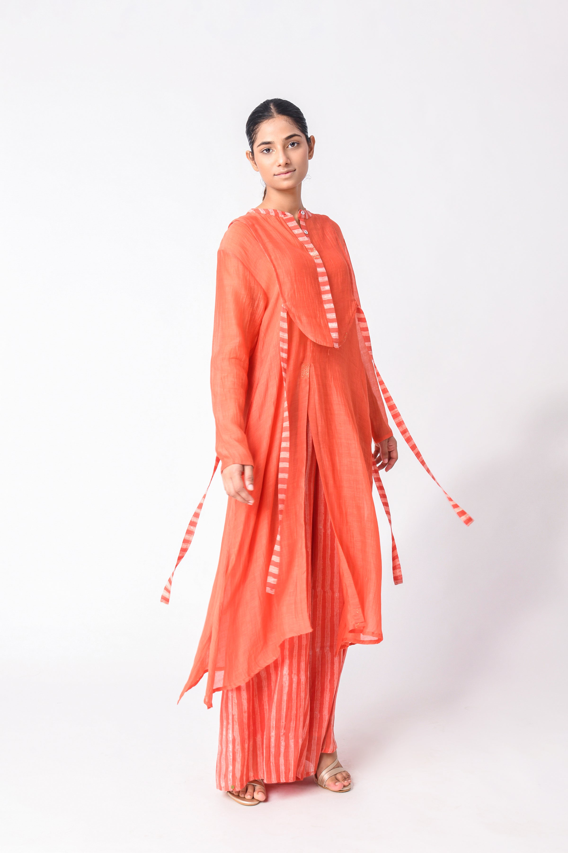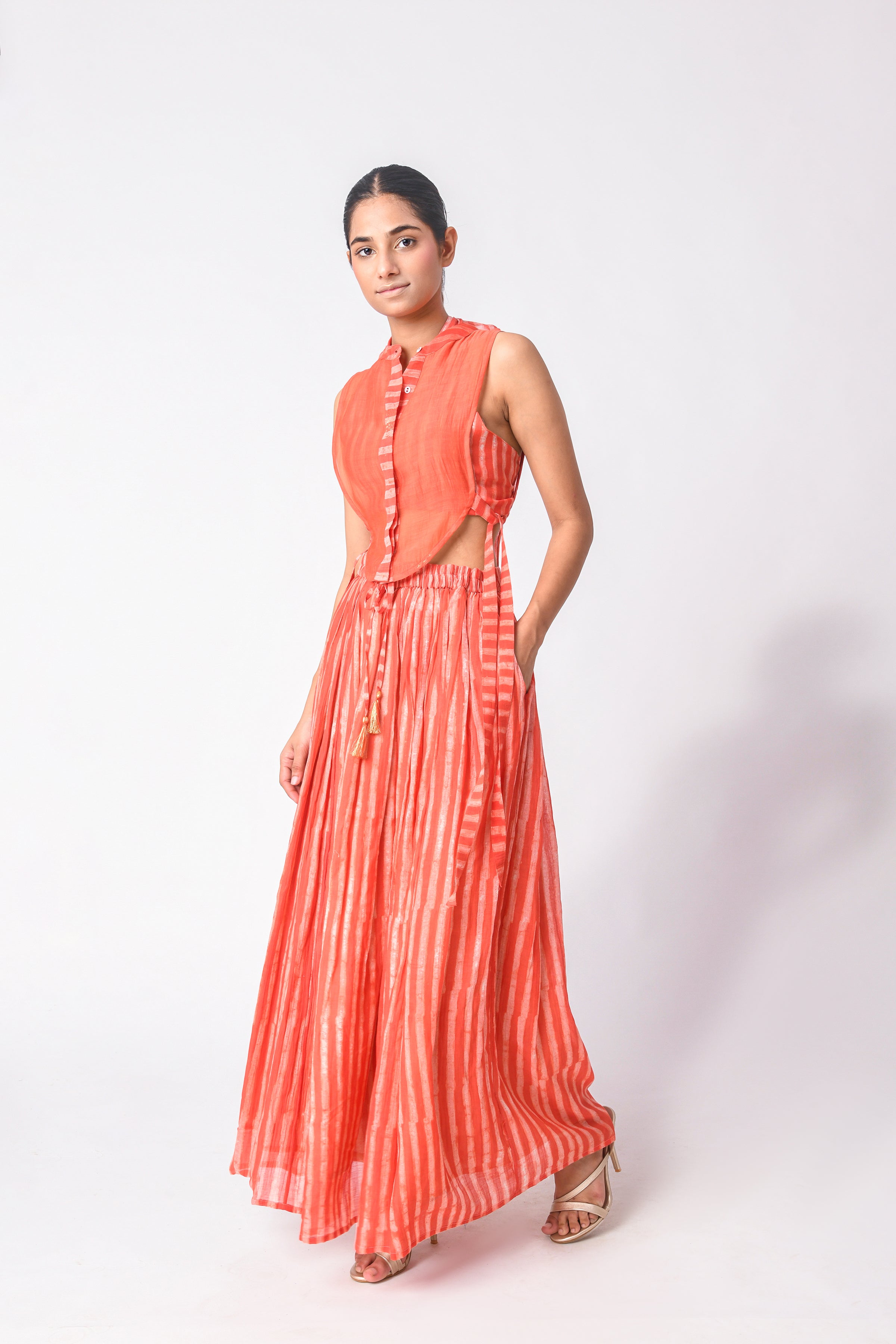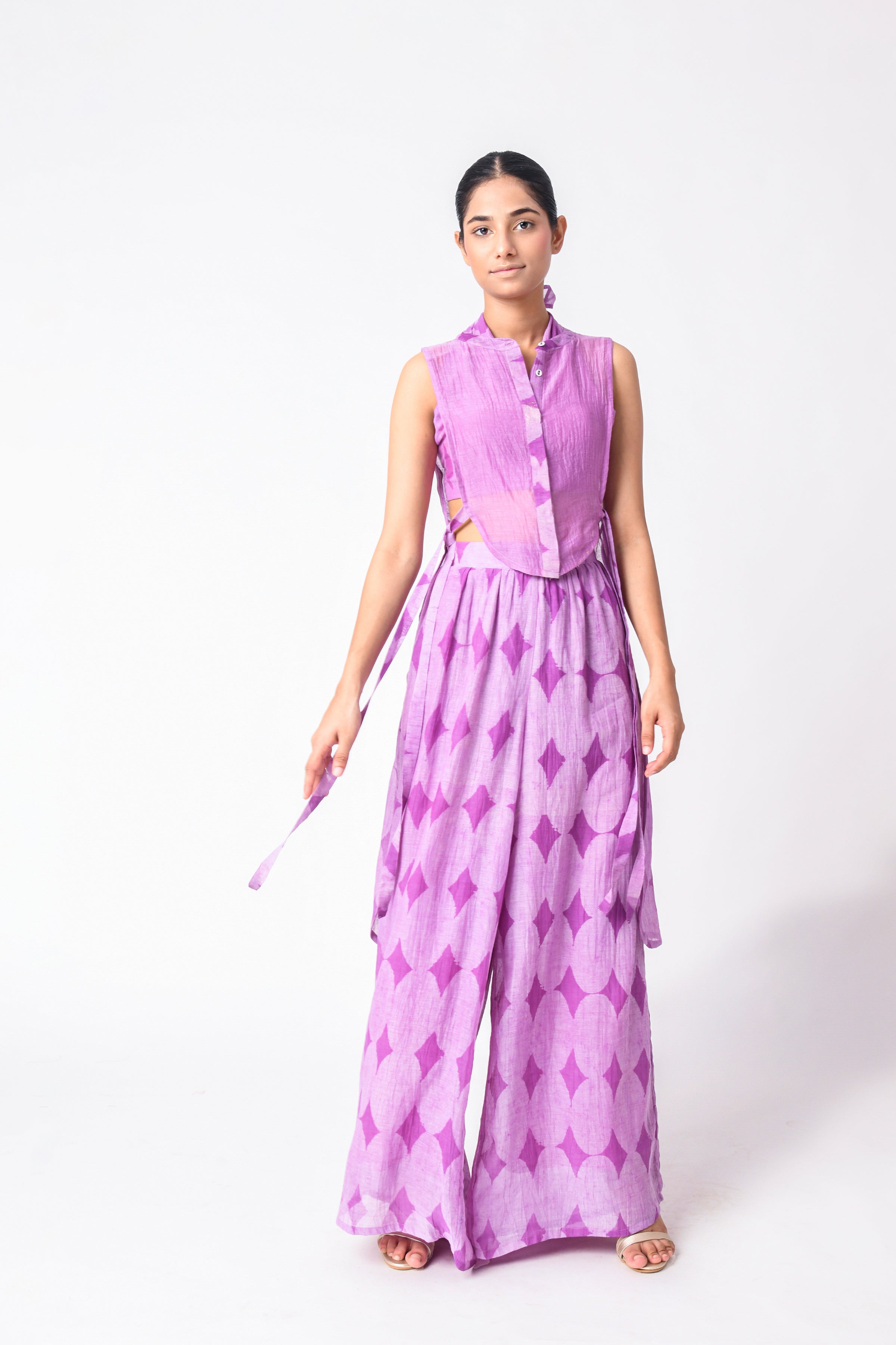 The modern busy life is all about convenience and ease, and co-ord Sets for women are those put-together outfits that make dressing every day a cakewalk. Our curation of Ciceroni goes a step forward as our selection is thoughtful and we do the due diligence about design and textile for you. So, while you may hastily put together the outfit, it will always look stylish and effortless. Co-ord Sets are a time-tested option for any occasion as they can transition from work to play with a little tuck-in or an eye-catching accessory. Our Co-ord Sets are utilitarian yet dressy, comfortable yet stylish, and modern yet timeless. They are the best trans-seasonal ‘fits as they can be layered, re-worn, or worn as separates…the options are endless. Our interesting picks will build character to your ensemble - look for little details like tie-ups, flared pants, fringes, alluring drapes, corsets, feminine cut to shorts and Bermudas, strappy bralette designs, embroidery, and woven Zari stripes, checks, and delicate motifs. Our contemporary version of these matching sets makes for easy-going and travel glam looks, geeky lounge fits, smart and sharp fits, breezy holiday feels or afternoons-spent-doing-nothing vibes. Luxurious textiles like Mashru Silk, handwoven indigenous Cotton weaves, Jamdani Cotton and Silk, Bemberg Cotton Satin, Linen, Chanderi and Hemp give way to versatile styles. The retro-esque renditions like pant suits, Bermuda co-ords, jacket co-ords, skirt co-ords, tunic co-ords, shirt co-ords, and kaftan co-ords feel too irresistible to not wear every other day. We reckon every Co-ord can also be worn as separates, hence increasing the wearability of your capsule wardrobe – whether they be printed, solids or colour blocked in summery bright colours, neutrals, pastels, ombre combinations and so on.