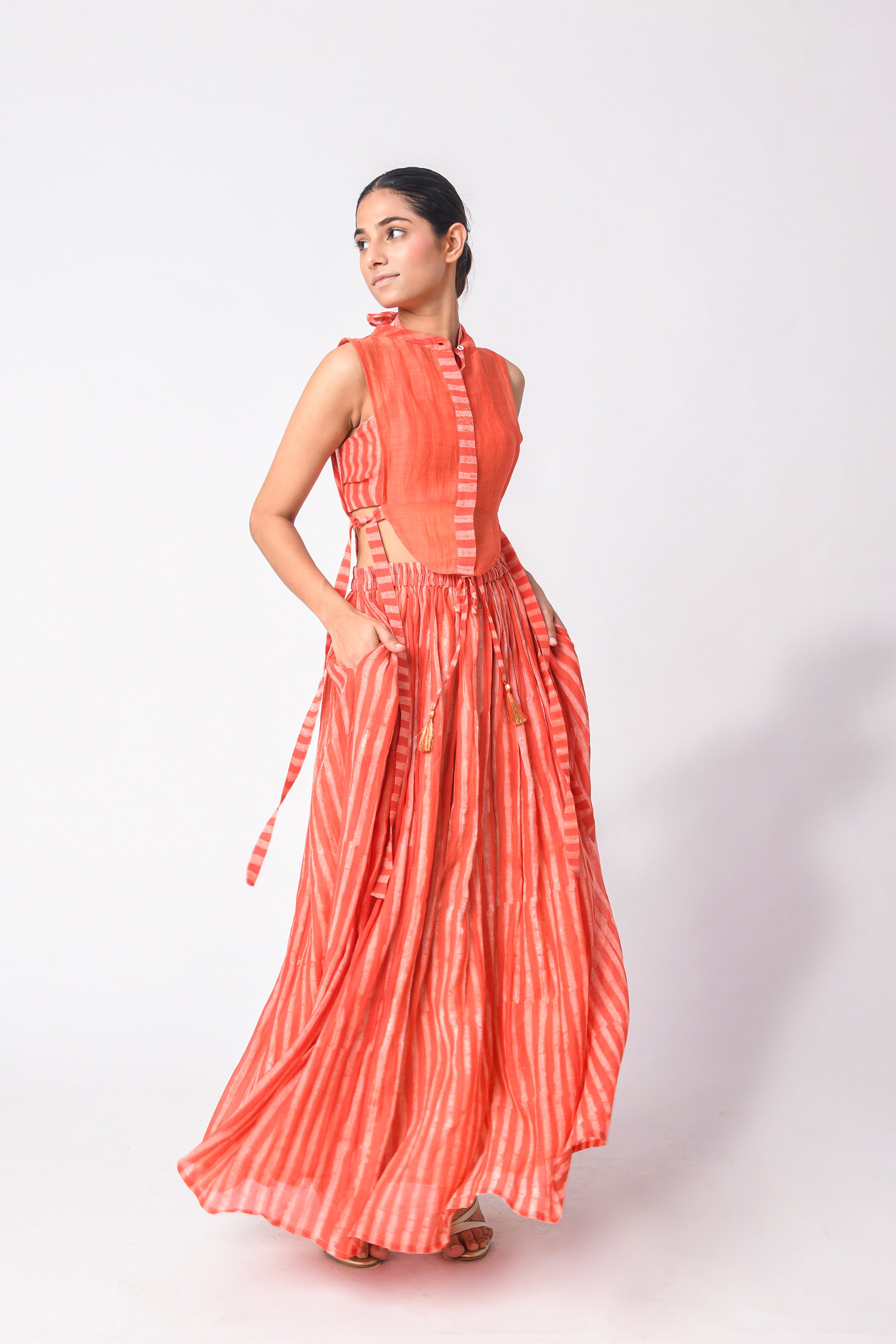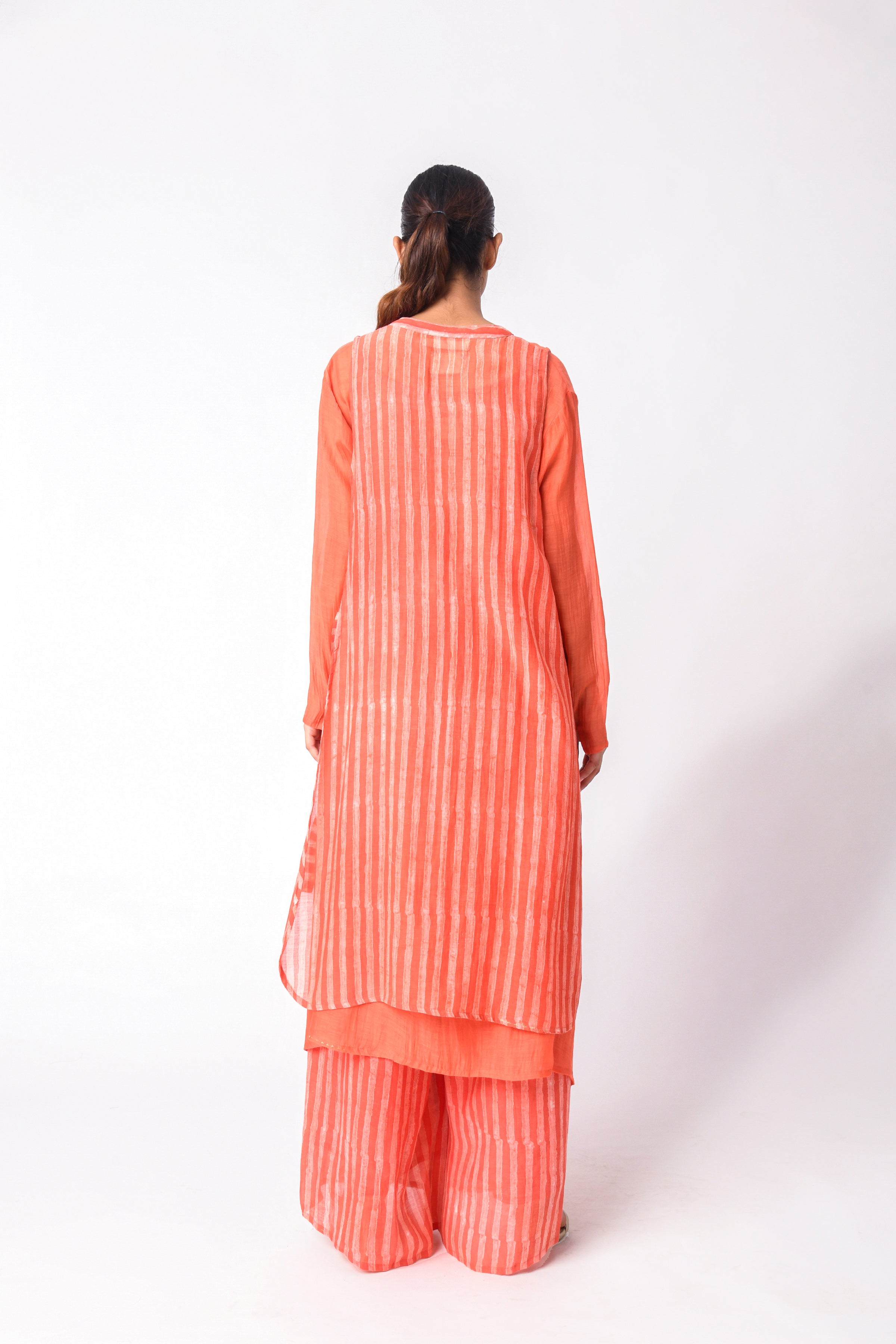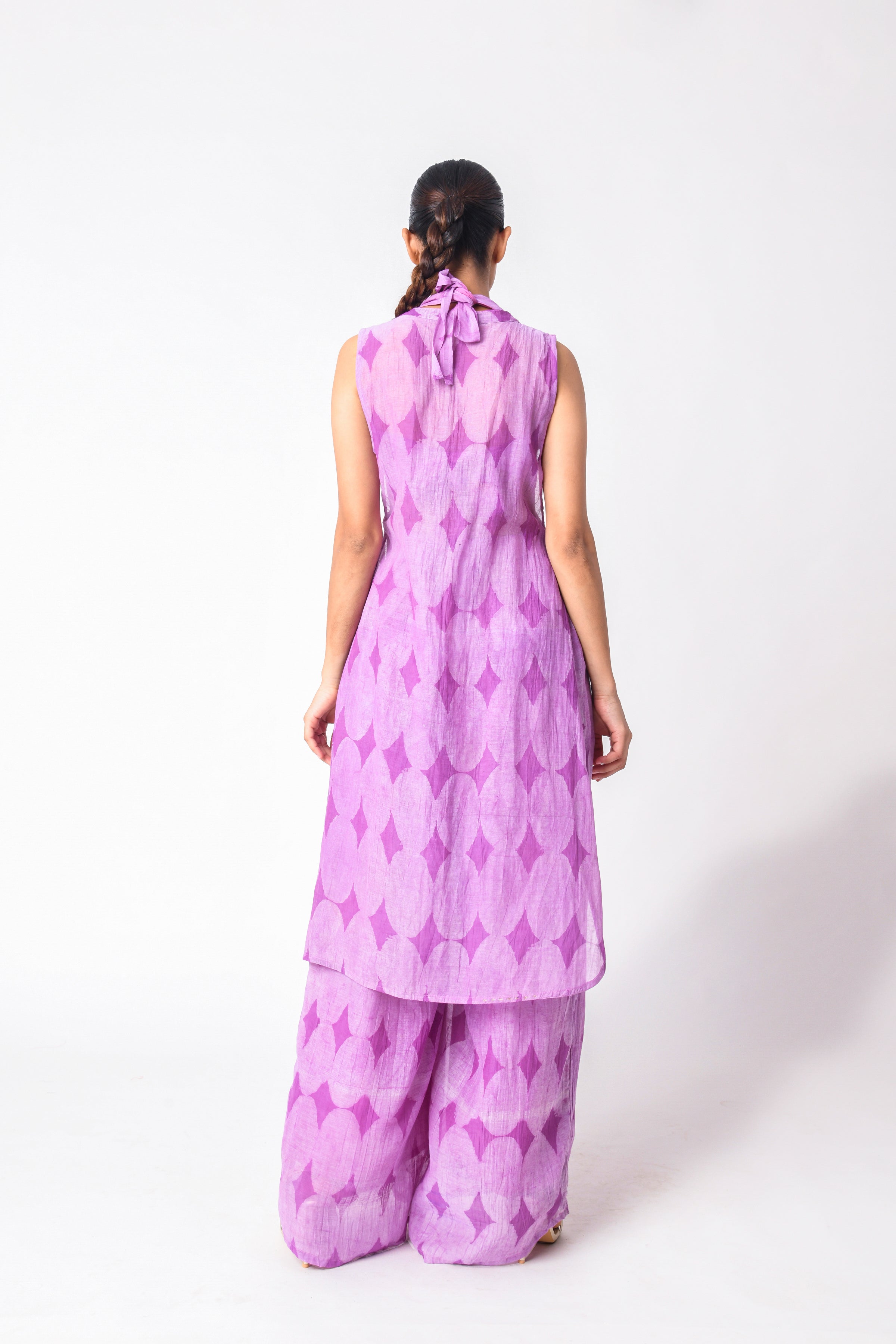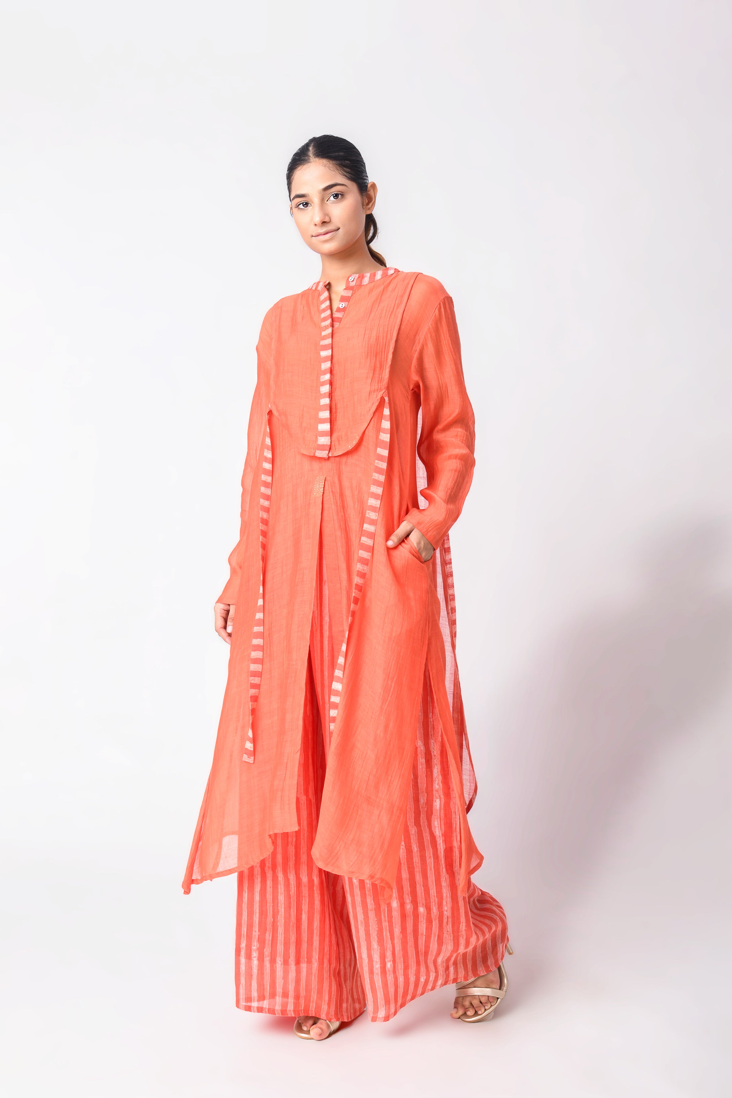 The modern busy life is all about convenience and ease, and co-ord Sets for women are those put-together outfits that make dressing every day a cakewalk. Our curation of Ciceroni goes a step forward as our selection is thoughtful and we do the due diligence about design and textile for you. So, while you may hastily put together the outfit, it will always look stylish and effortless. Co-ord Sets are a time-tested option for any occasion as they can transition from work to play with a little tuck-in or an eye-catching accessory. Our Co-ord Sets are utilitarian yet dressy, comfortable yet stylish, and modern yet timeless. They are the best trans-seasonal ‘fits as they can be layered, re-worn, or worn as separates…the options are endless. Our interesting picks will build character to your ensemble - look for little details like tie-ups, flared pants, fringes, alluring drapes, corsets, feminine cut to shorts and Bermudas, strappy bralette designs, embroidery, and woven Zari stripes, checks, and delicate motifs. Our contemporary version of these matching sets makes for easy-going and travel glam looks, geeky lounge fits, smart and sharp fits, breezy holiday feels or afternoons-spent-doing-nothing vibes. Luxurious textiles like Mashru Silk, handwoven indigenous Cotton weaves, Jamdani Cotton and Silk, Bemberg Cotton Satin, Linen, Chanderi and Hemp give way to versatile styles. The retro-esque renditions like pant suits, Bermuda co-ords, jacket co-ords, skirt co-ords, tunic co-ords, shirt co-ords, and kaftan co-ords feel too irresistible to not wear every other day. We reckon every Co-ord can also be worn as separates, hence increasing the wearability of your capsule wardrobe – whether they be printed, solids or colour blocked in summery bright colours, neutrals, pastels, ombre combinations and so on.