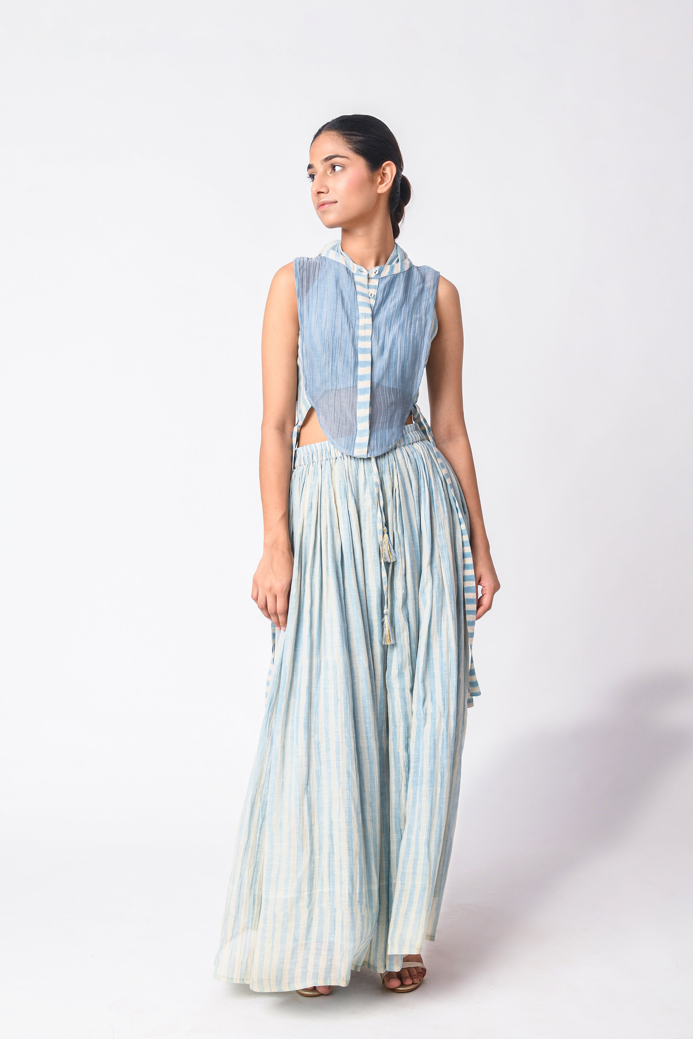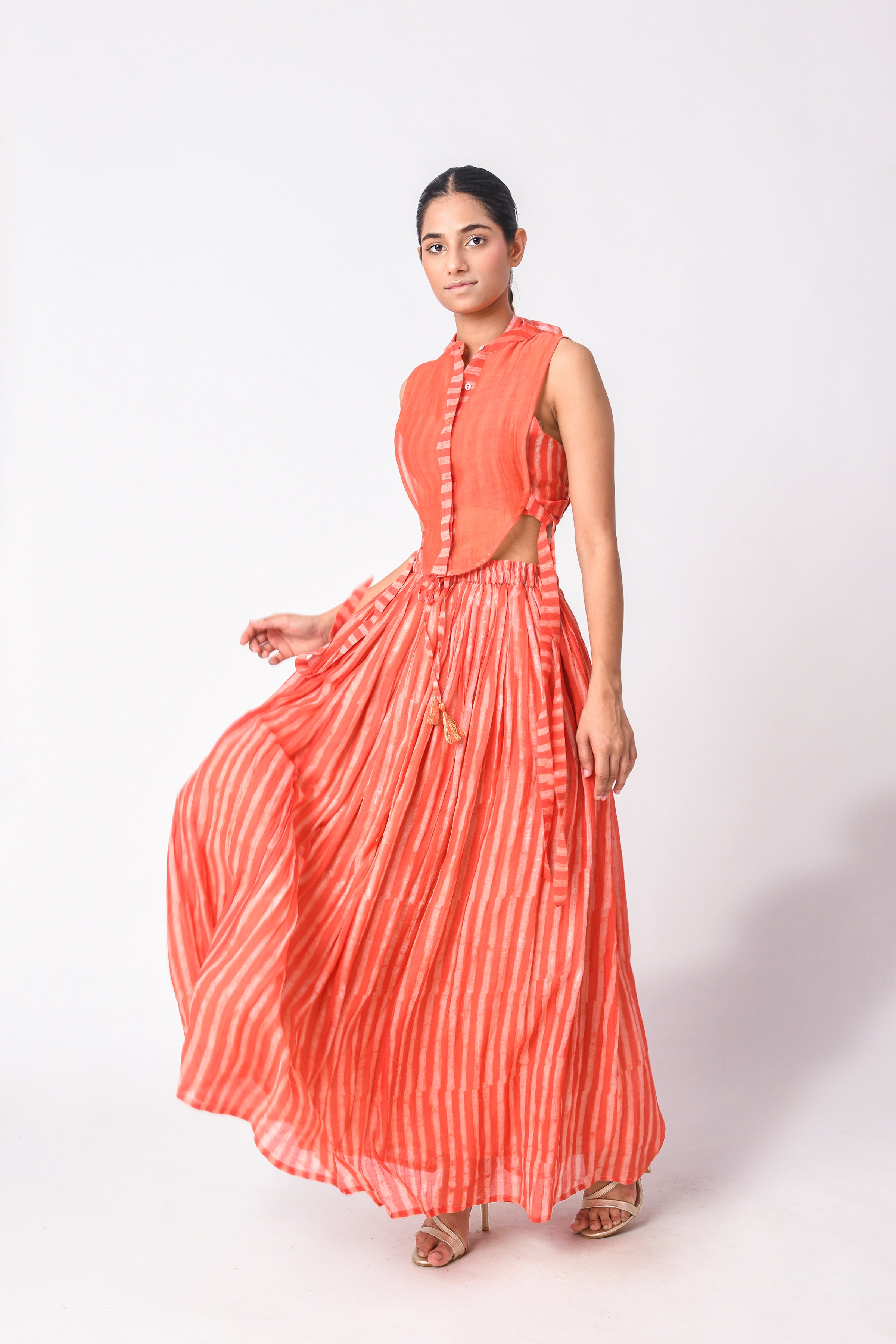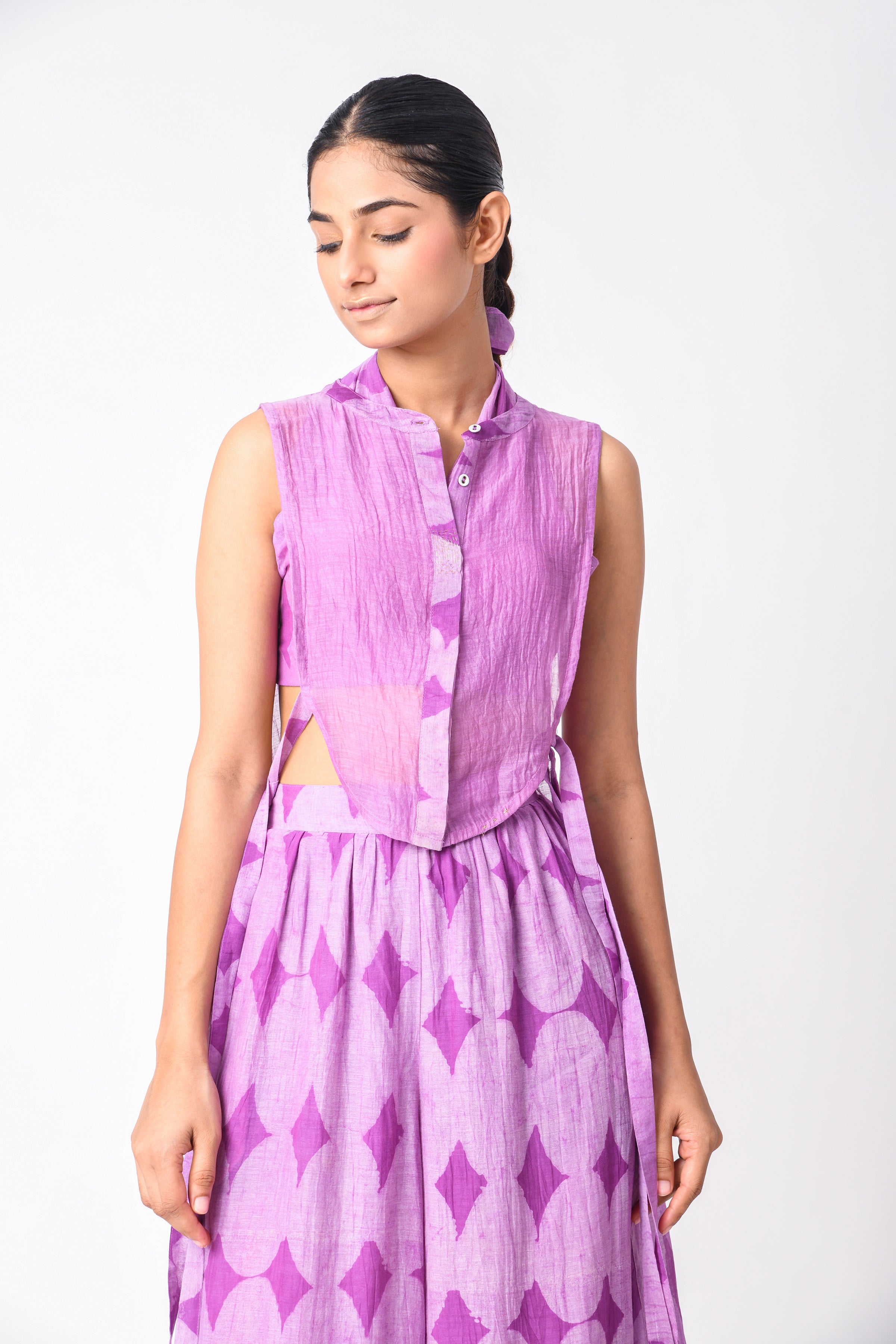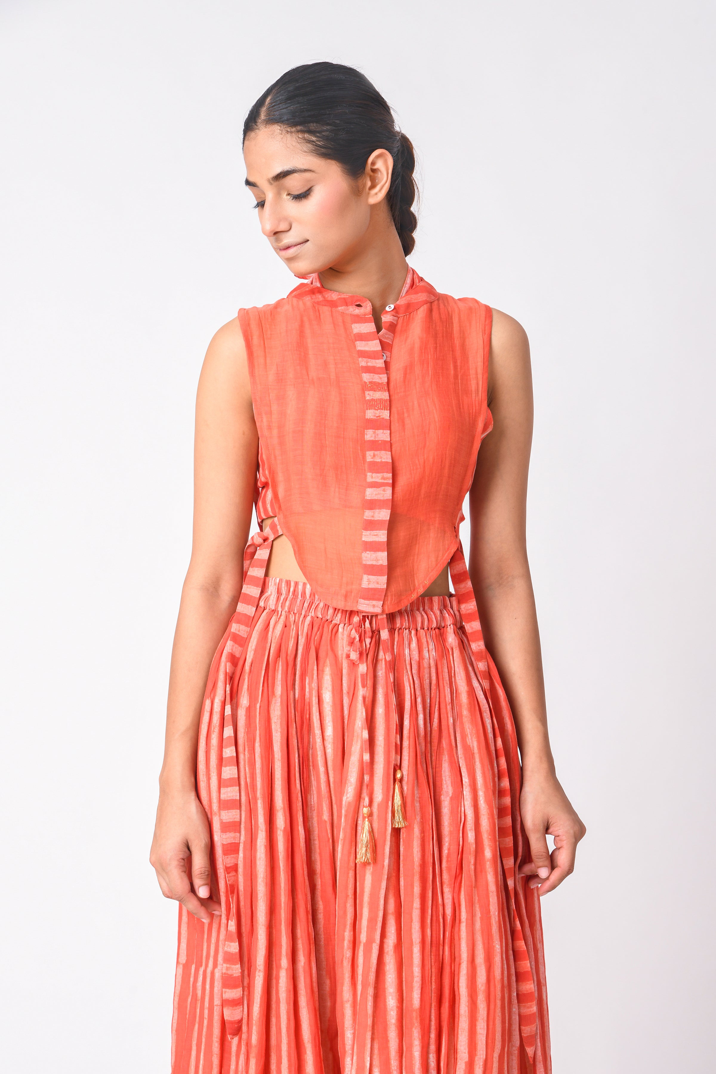The modern busy life is all about convenience and ease, and co-ord Sets for women are those put-together outfits that make dressing every day a cakewalk. Our curation of Ciceroni goes a step forward as our selection is thoughtful and we do the due diligence about design and textile for you. So, while you may hastily put together the outfit, it will always look stylish and effortless. Co-ord Sets are a time-tested option for any occasion as they can transition from work to play with a little tuck-in or an eye-catching accessory. Our Co-ord Sets are utilitarian yet dressy, comfortable yet stylish, and modern yet timeless. They are the best trans-seasonal ‘fits as they can be layered, re-worn, or worn as separates…the options are endless. Our interesting picks will build character to your ensemble - look for little details like tie-ups, flared pants, fringes, alluring drapes, corsets, feminine cut to shorts and Bermudas, strappy bralette designs, embroidery, and woven Zari stripes, checks, and delicate motifs. Our contemporary version of these matching sets makes for easy-going and travel glam looks, geeky lounge fits, smart and sharp fits, breezy holiday feels or afternoons-spent-doing-nothing vibes. Luxurious textiles like Mashru Silk, handwoven indigenous Cotton weaves, Jamdani Cotton and Silk, Bemberg Cotton Satin, Linen, Chanderi and Hemp give way to versatile styles. The retro-esque renditions like pant suits, Bermuda co-ords, jacket co-ords, skirt co-ords, tunic co-ords, shirt co-ords, and kaftan co-ords feel too irresistible to not wear every other day. We reckon every Co-ord can also be worn as separates, hence increasing the wearability of your capsule wardrobe – whether they be printed, solids or colour blocked in summery bright colours, neutrals, pastels, ombre combinations and so on.