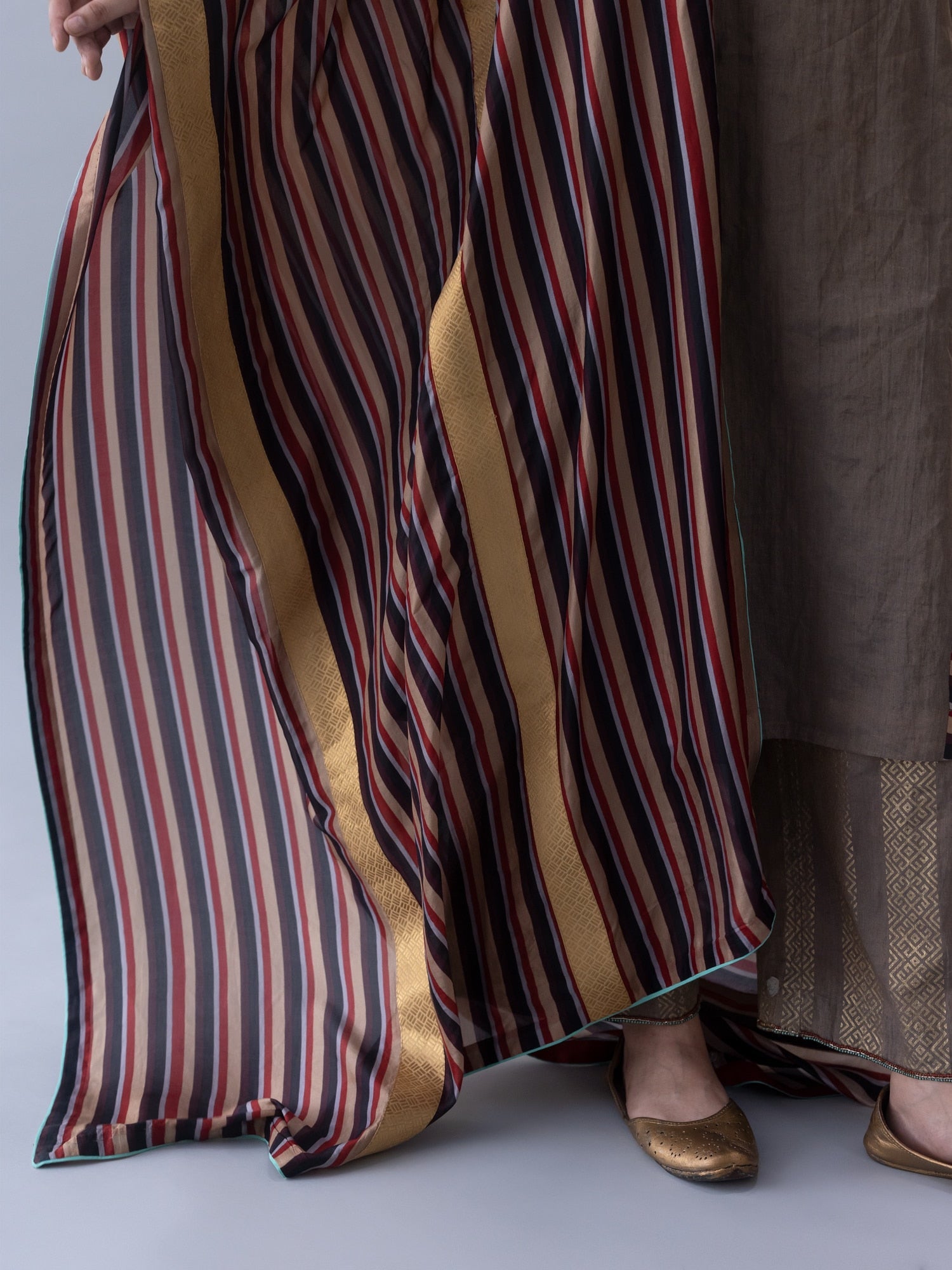 The Nyima Black Dupatta showcases refined elegance through thoughtful design contrasts. Woven in sumptuous multi tabby silk, it features an all-over stripe print that adds visual depth and movement. Subtle haze piping frames the piece with understated sophistication, while a striking red facing delivers bold warmth and contemporary edge.