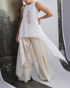 A coordinated set in handloom Chanderi featuring a gold leaf–embroidered off-white hi-lo top and fluid Farshi-style trousers with matted gold stripes. Detailed with lace and a pleated georgette back, the ensemble offers understated luxury and effortless festive elegance.