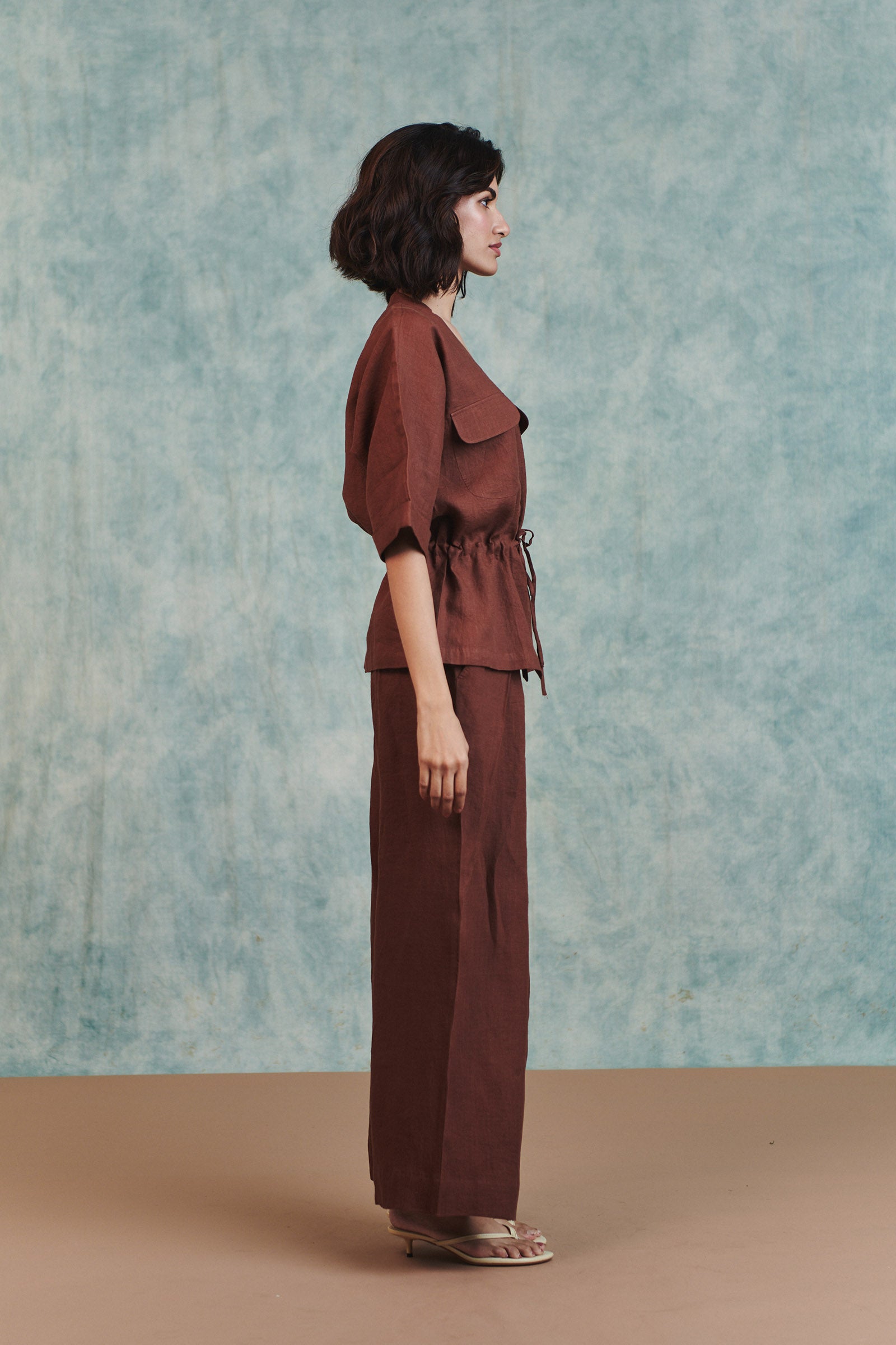 A wide-leg trouser defined by soft pleats and clean tuck detailing, offering structure while retaining an effortless ease. The silhouette falls fluidly, creating a balanced interplay between tailored form and relaxed movement. Versatile in its styling, it pairs seamlessly with shirts, wrap tops, and lighter layers, transitioning with ease from everyday plans to more polished occasions.