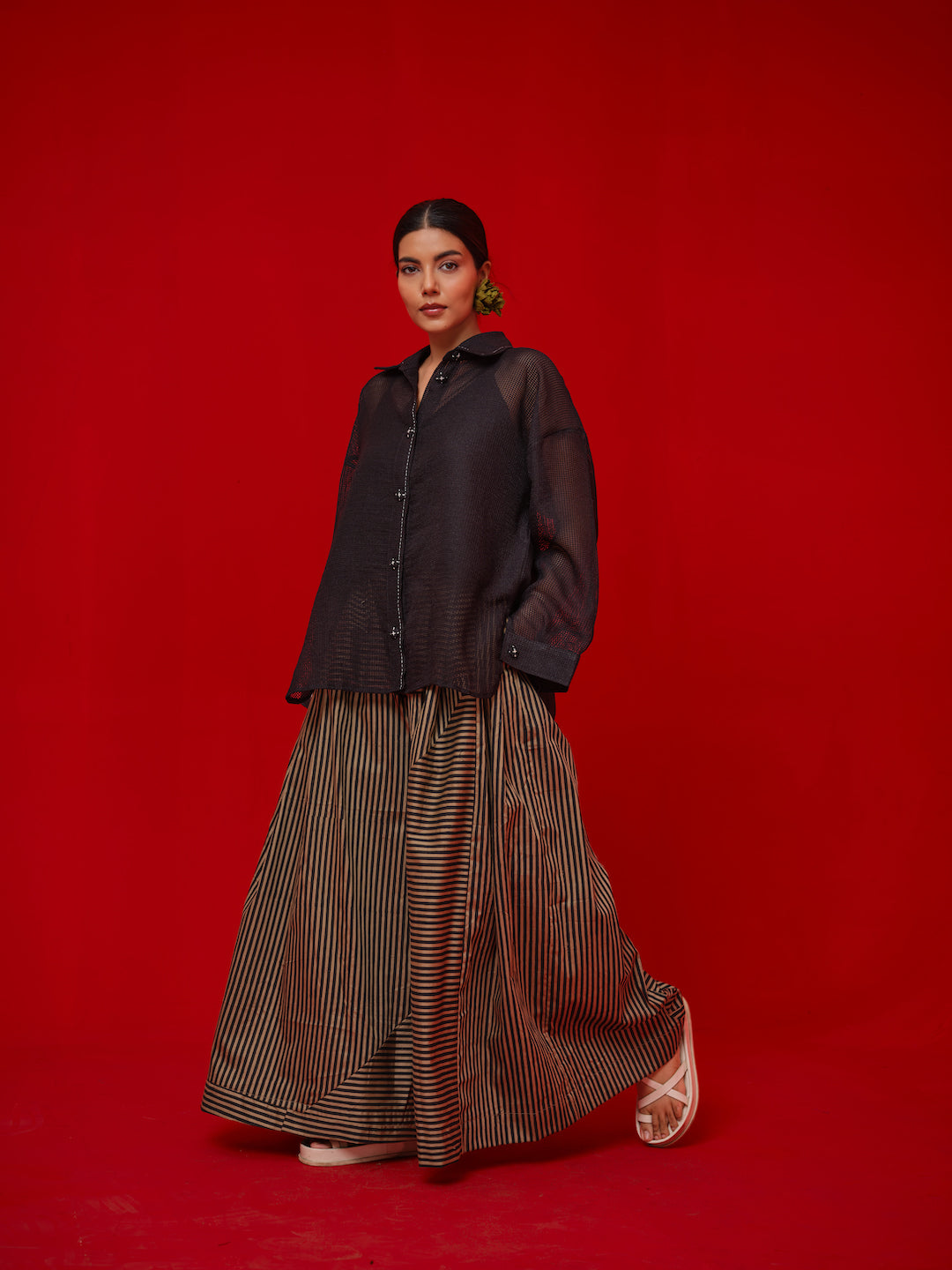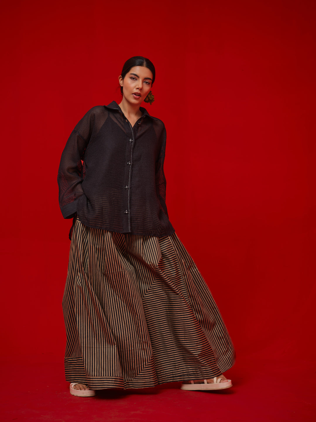 Flare trousers crafted in rich Italian cotton with hand block-printed stripes. Designed with random patchwork for an asymmetric stripe placement.