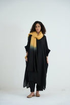 The Angela Kaftan Set features a soft cotton silk kaftan with delicate lace accents on the sleeves and neckline, perfect for festive occasions. It comes with slim vegan silk pants detailed with lace at the hem, complemented by an ombre cotton silk dupatta adorned with cut dana lace for an elegant finish.
