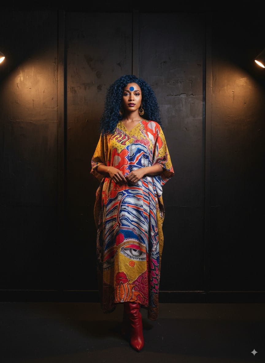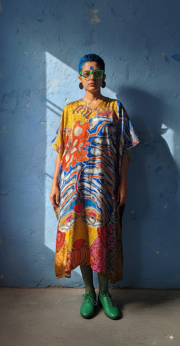 The Blue-Blessed Durga Kaftan embodies a serene blend of depth, elegance, and artistry. Rendered in rich shades of blue, its fluid silhouette drapes effortlessly, offering a light and graceful feel against the skin. Thoughtfully designed for women who appreciate kaftans for women that unite comfort with refined style, it moves seamlessly from intimate evening gatherings to meaningful festive moments.