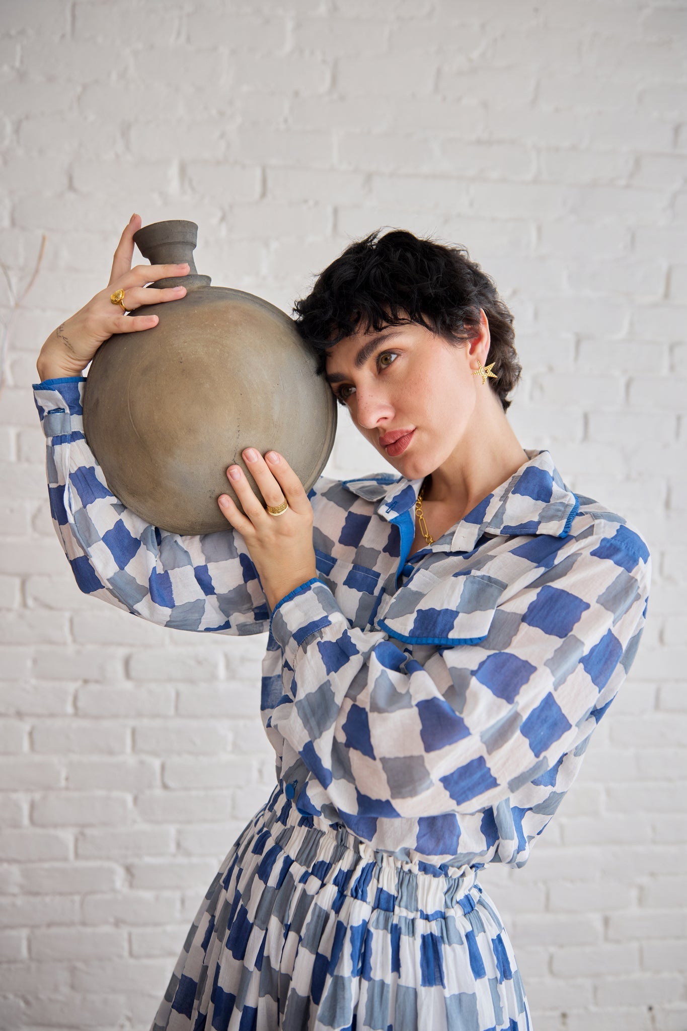 The Blue Pixel Shirt features a relaxed fit in ultra-soft, hand-dyed cotton mulmul with a calming checkerboard print.