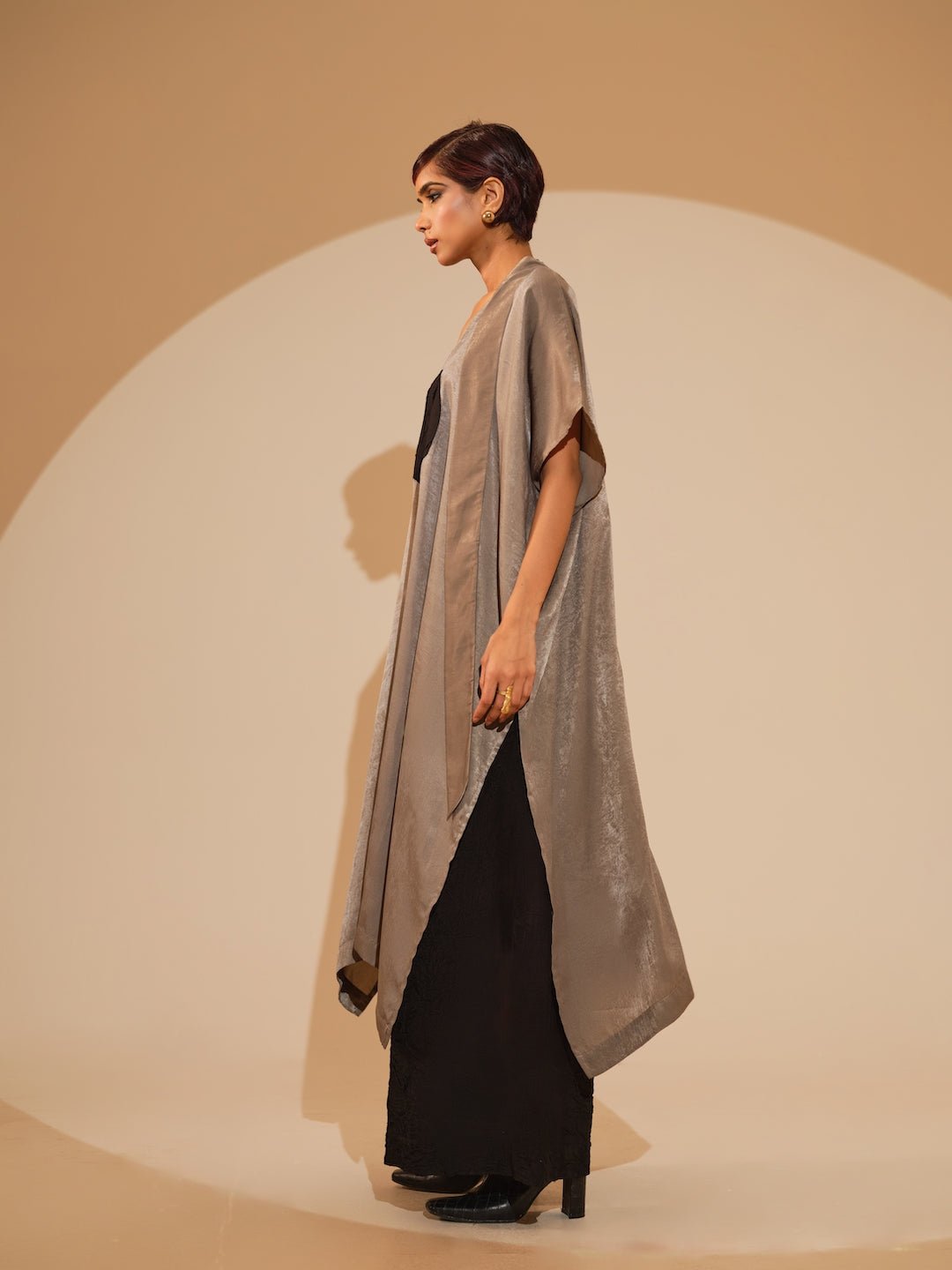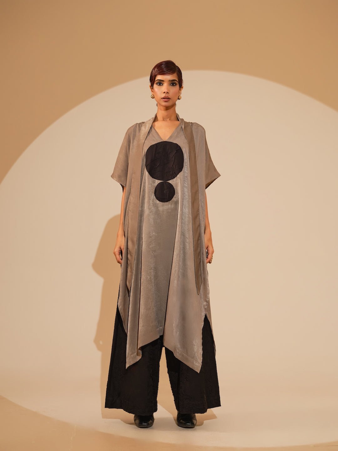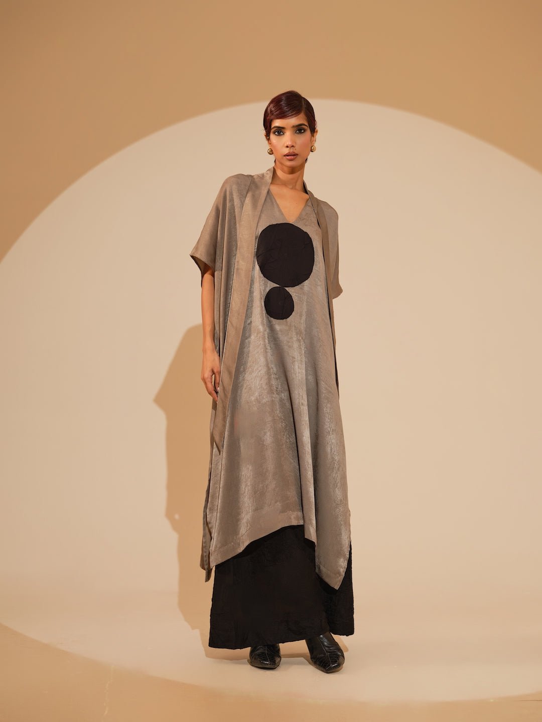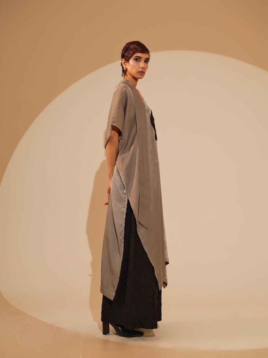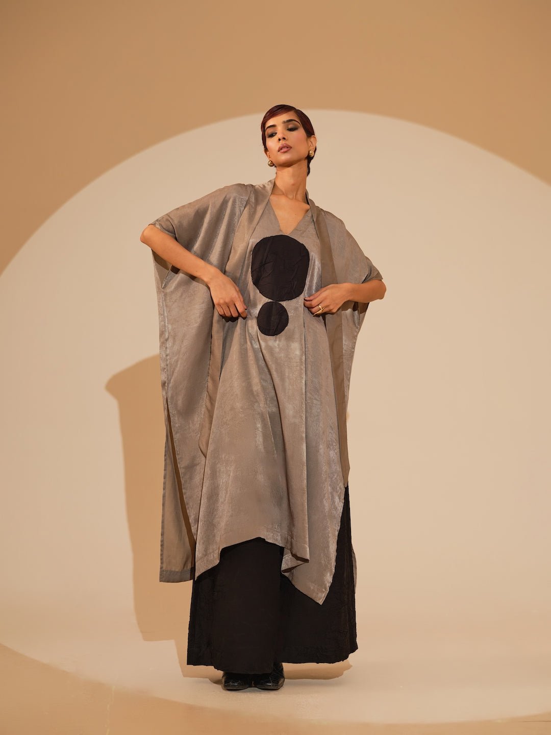 Kaftan has V-neck, half sleeves, side slits and atttached ribbon at neck