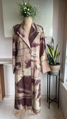The Desert Mirage Trench Dress features an earthy abstract print kimono jacket paired with a cotton straight-fit dress, crafted from luxurious Bemberg silk and Egyptian cotton for a sophisticated and comfortable ensemble.