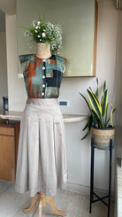 The Earthlines Top & Skirt Set features a multicolour abstract printed crop top with structured shoulder pads for a commanding silhouette, paired with a box pleat skirt crafted from luxurious Bemberg silk and Egyptian cotton for a polished and sophisticated look.