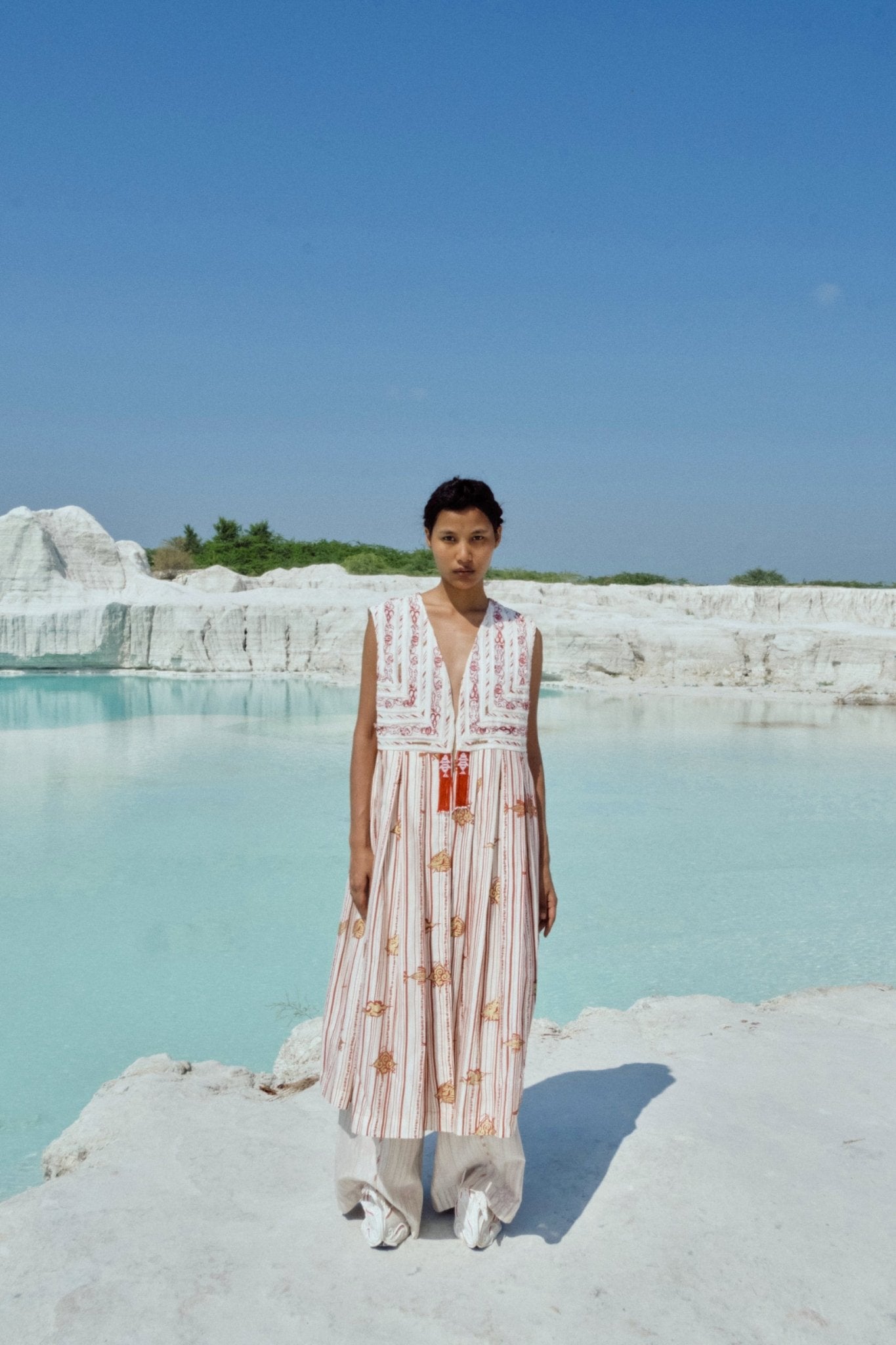 The Kalaia Lace Jacket merges artisanal craftsmanship with contemporary elegance. Hand-screen-printed onto a luxurious cotton-silk blend, this piece layers geometric bias binding with delicate embroidered lace in a carefully orchestrated design. Every detail, from the precise alignment of floral motifs to the structured yet fluid silhouette, reflects meticulous skill and attention. The result is a refined jacket that moves with ease while maintaining timeless sophistication, perfect for those who appreciate the intersection of print artistry and refined tailoring.