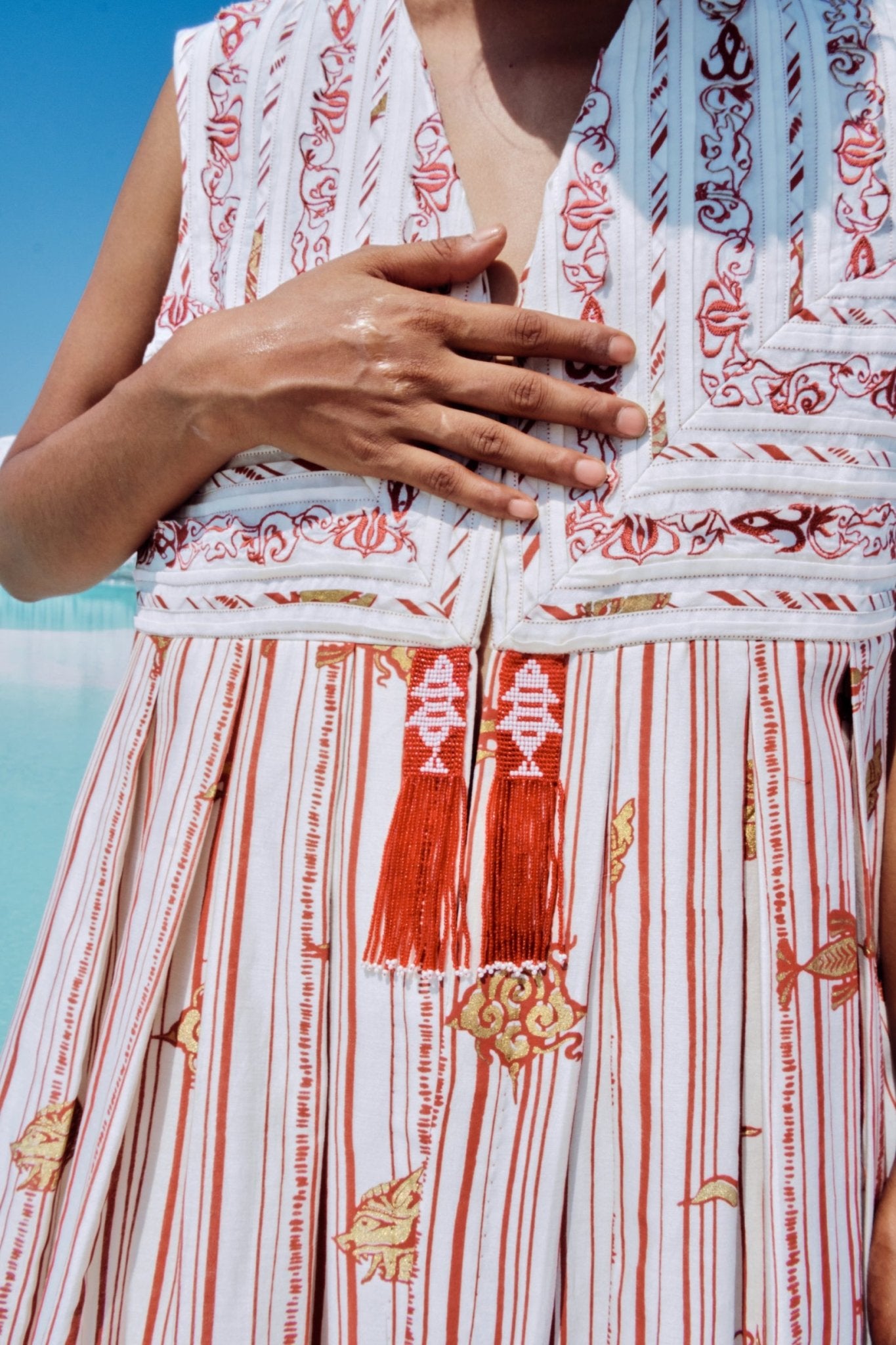 - Jacket has open front, hand-embroidered lace and binding detail, mitered yoke and beaded tassels.