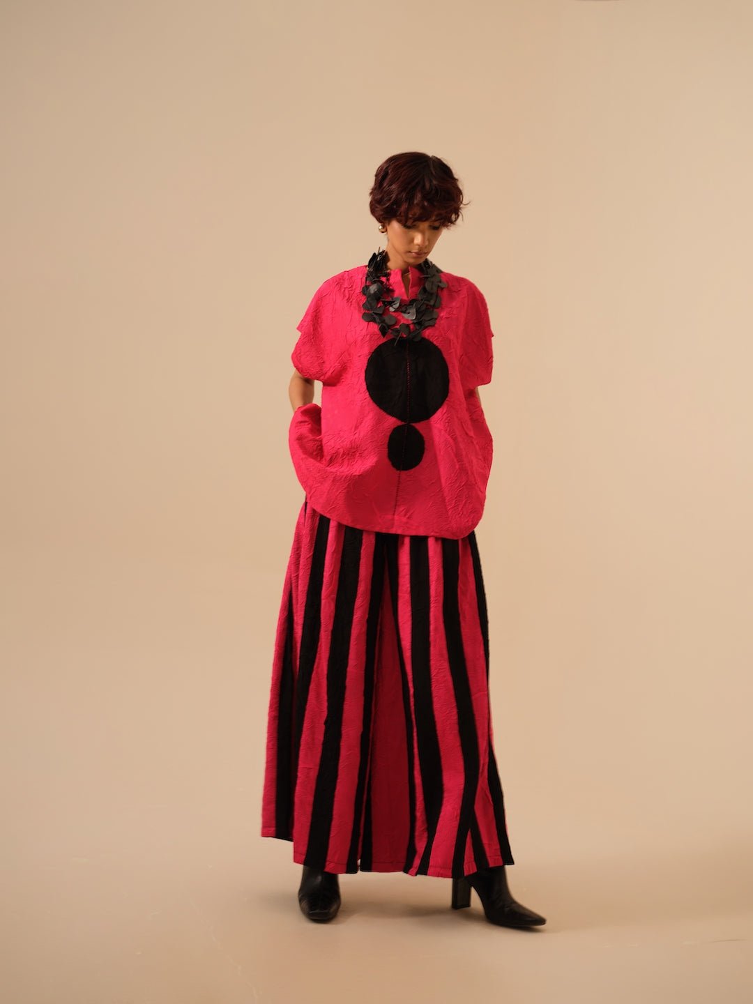 A one-size top crafted in hand-crushed silk, made in-house for its unique texture and fluid drape. It features a hand-embroidered circular appliqué rendered in traditional Kantha stitching each motif individually crafted by our artisans. The relaxed silhouette and artisanal detail make it a statement of ease and craftsmanship.
