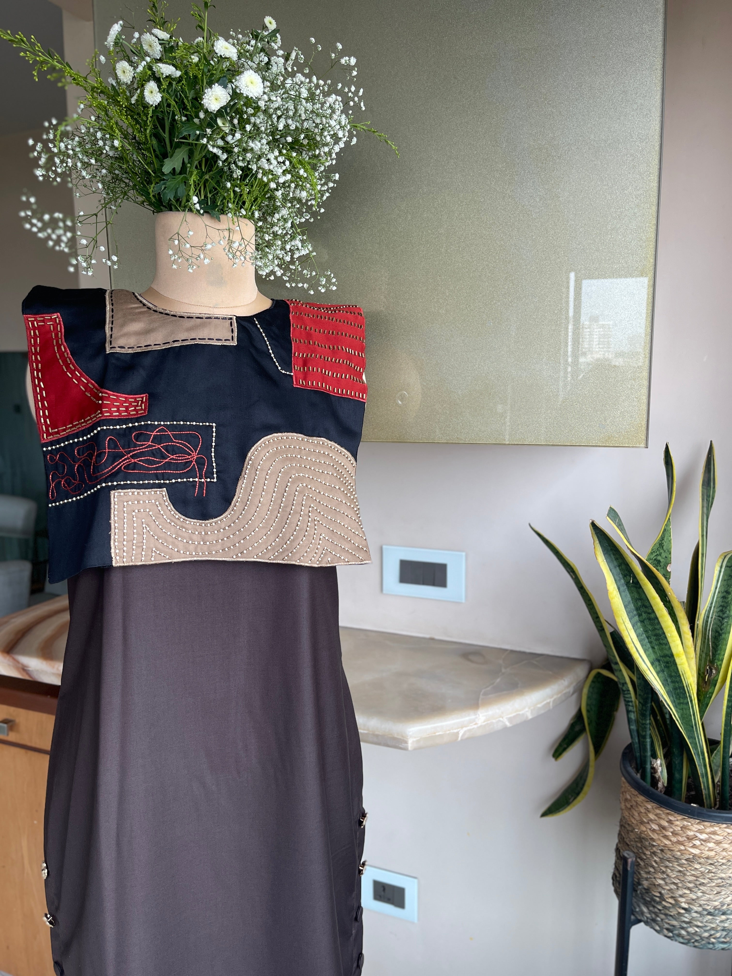 Elevate your wardrobe with the Monolith Patch Front Short Dress, featuring exquisite hand-embroidered patchwork that defines artistry and elegance. Crafted from premium suiting fabric, this brown dress blends refined craftsmanship with a contemporary silhouette, making it a smart statement piece for sophisticated occasions.