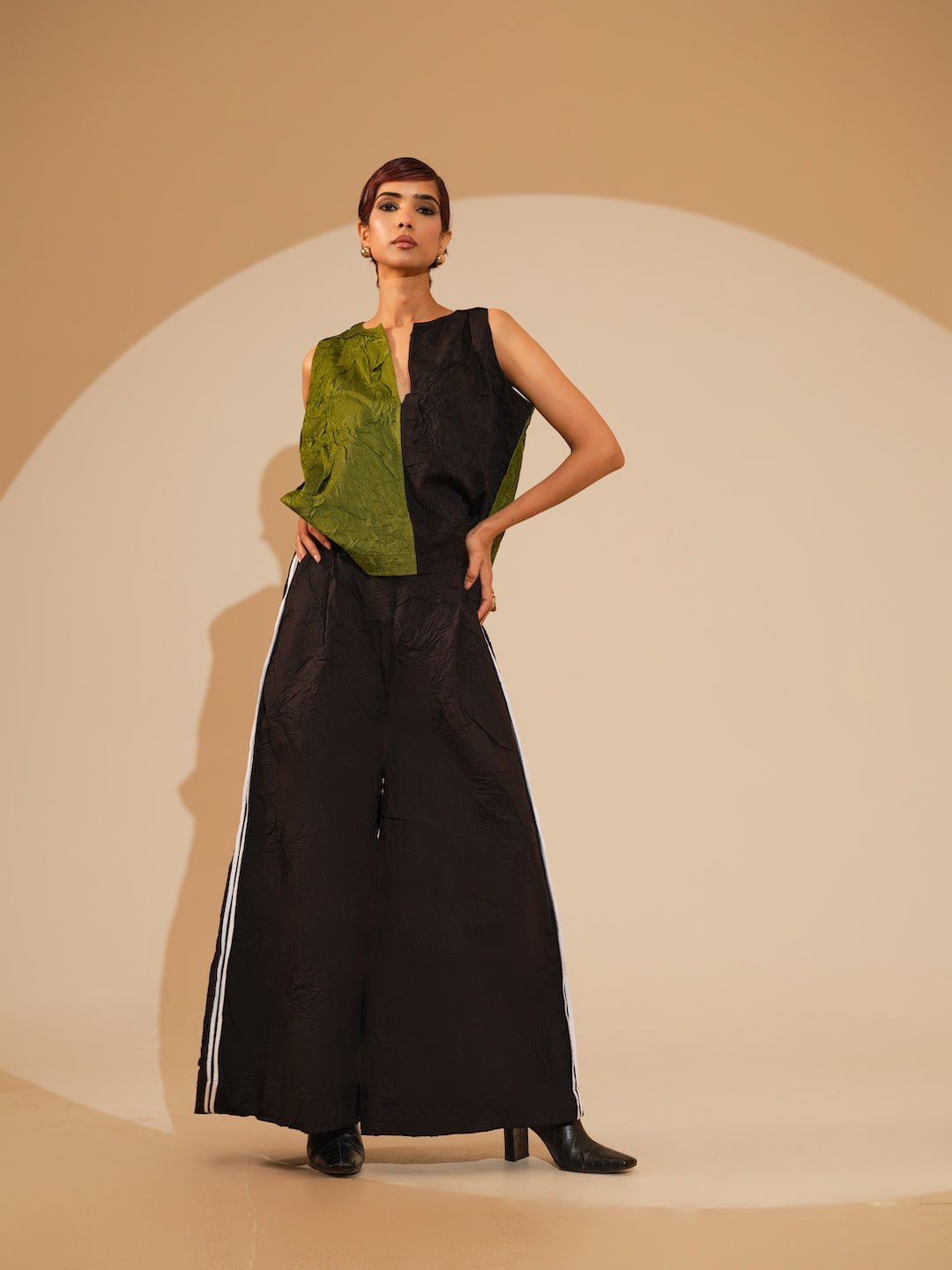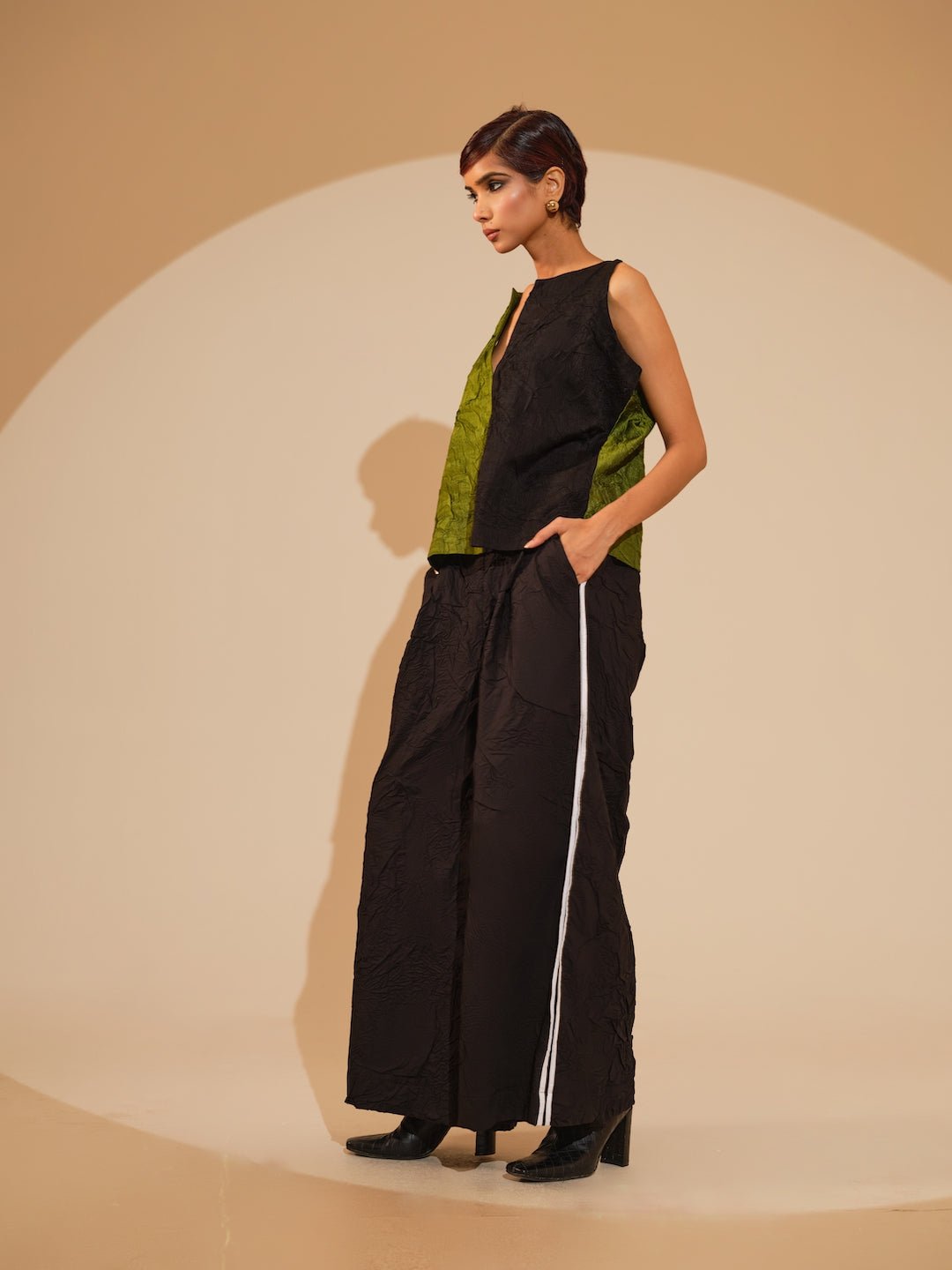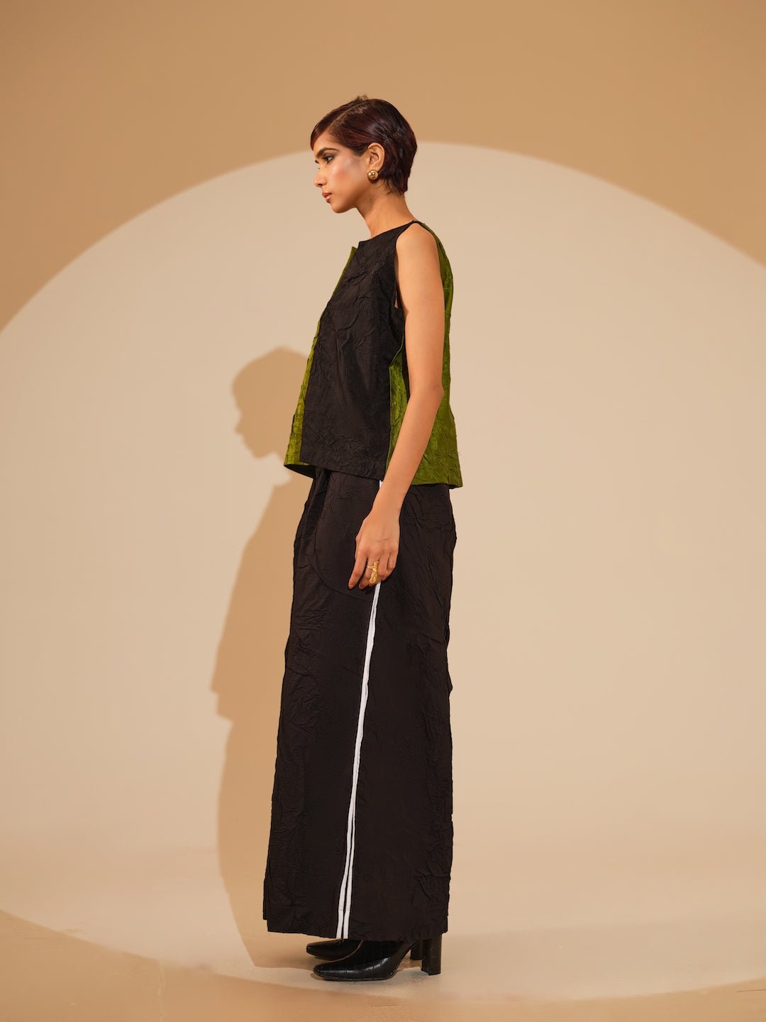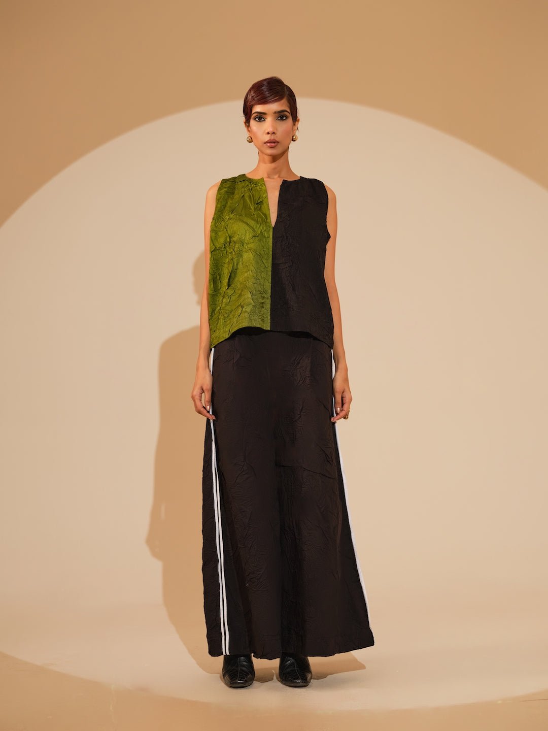 Discover refined elegance with this hand-crushed silk top, meticulously produced in-house to achieve its distinctive tactile quality and graceful movement. The sophisticated silhouette showcases striking color blocking and expertly tailored in-cut shoulders, creating a contemporary yet timeless piece that elevates any wardrobe.