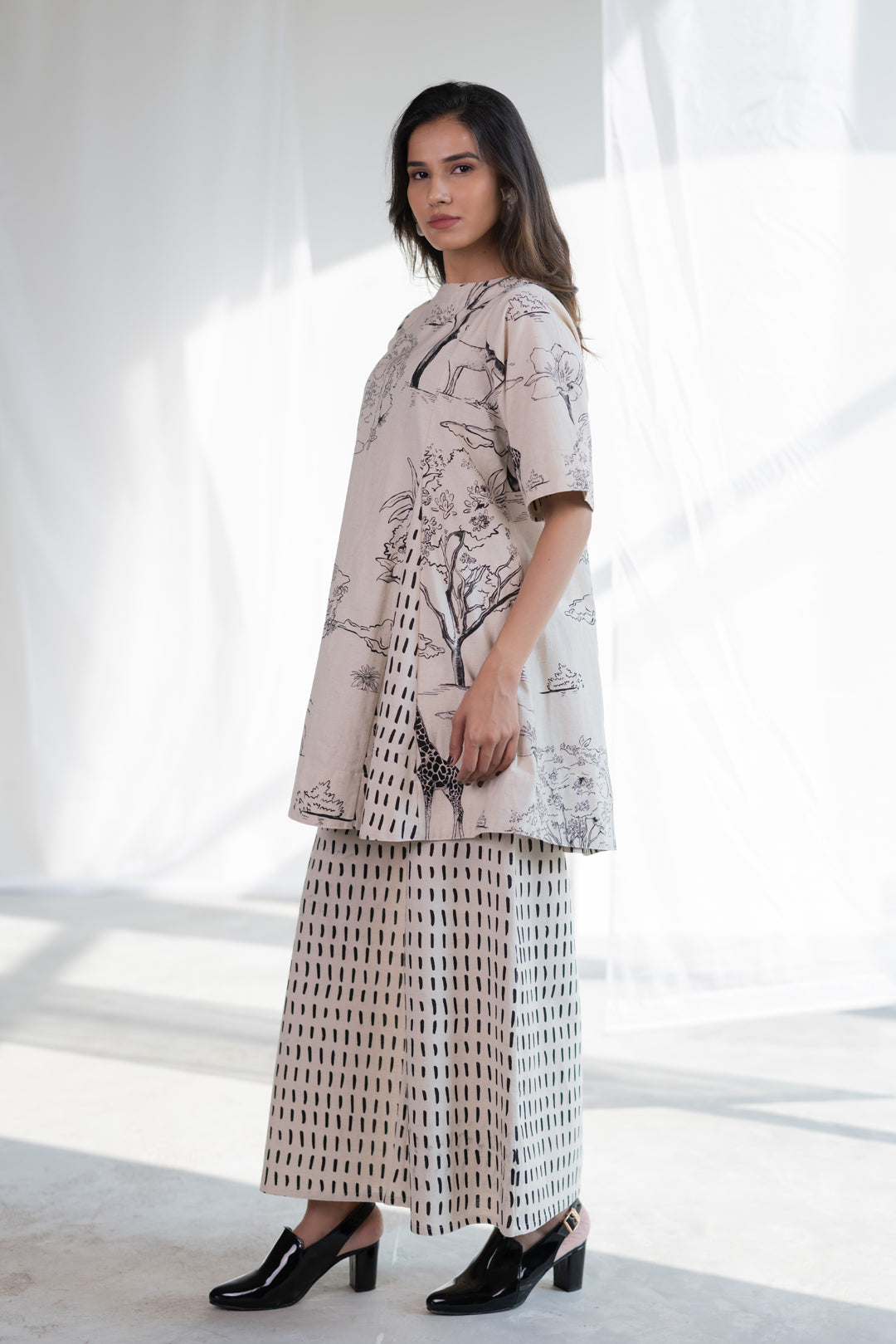 - Features scenic print detailing on tunic with contrast dot-printed pants