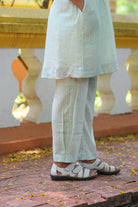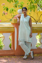 Elevate your style with the Rita Branca Co-ord Set. Featuring a hand-block printed V-neck tunic with pleated details and a fully lined mul cotton construction, this set exudes luxury. The elasticized pants with contrast inseam details and attached mul cotton shorts with side pockets add functionality.