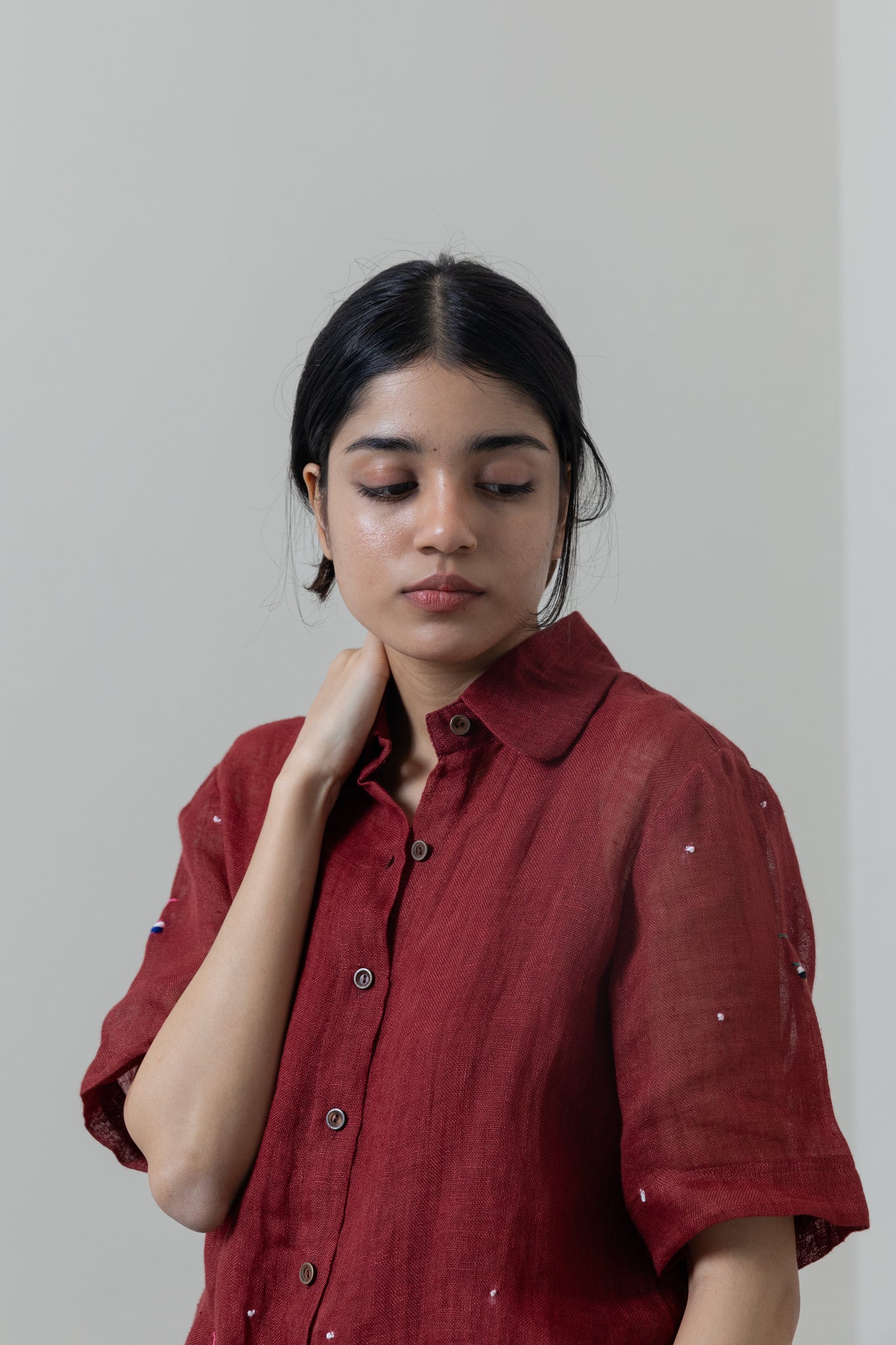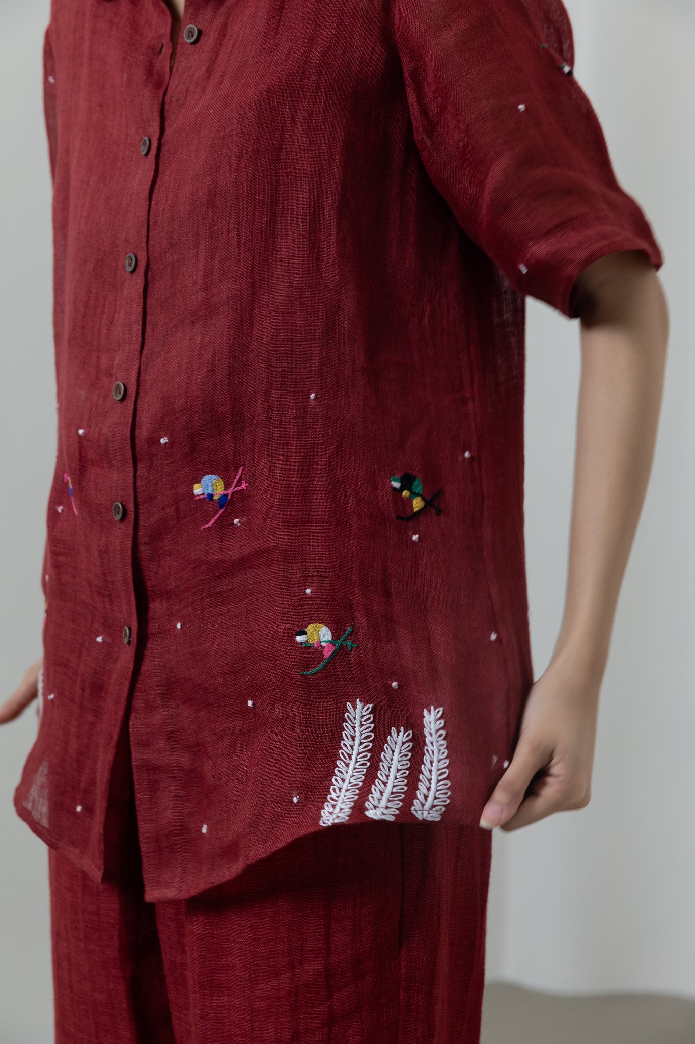 - Shirt has hand-embroidery detailing