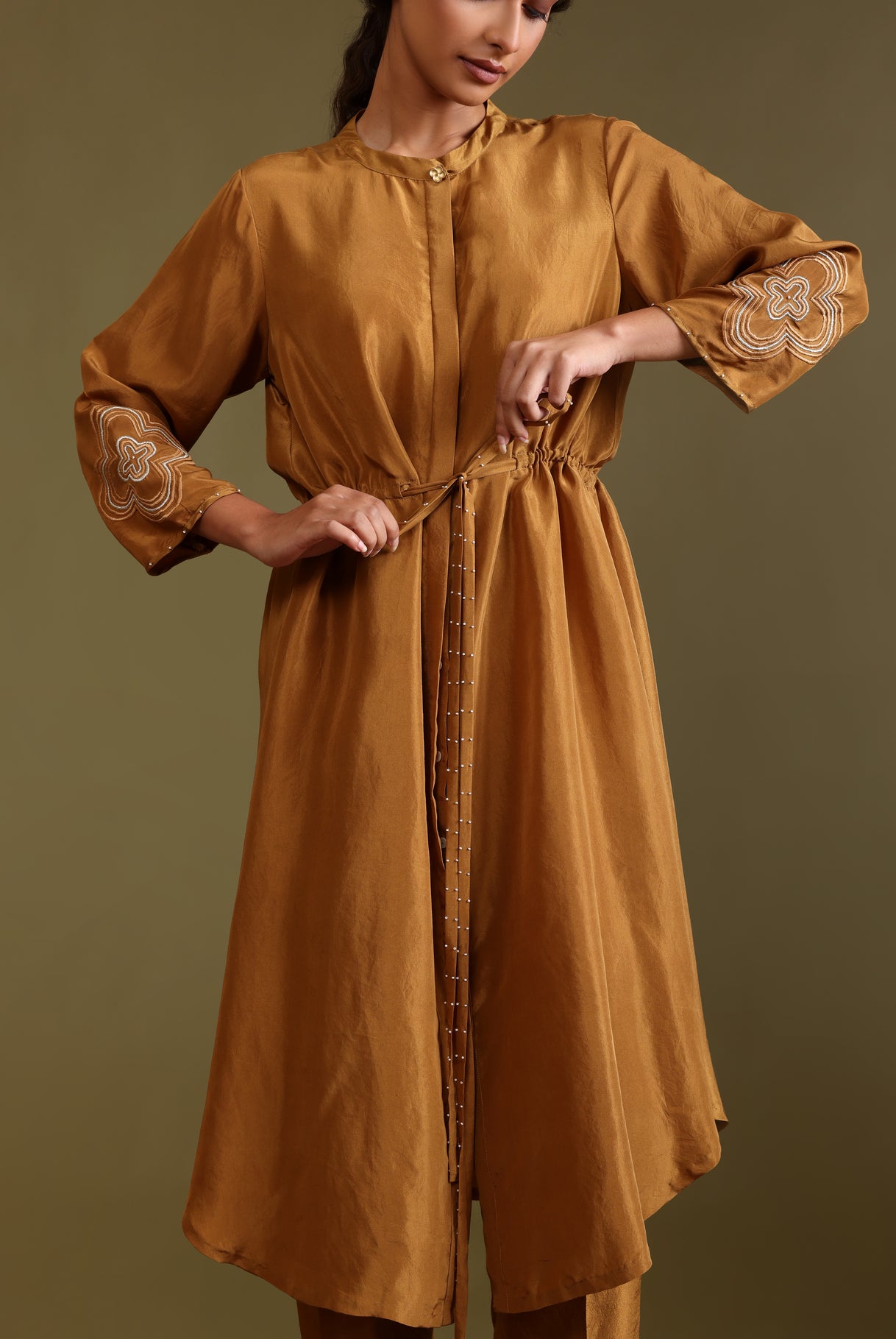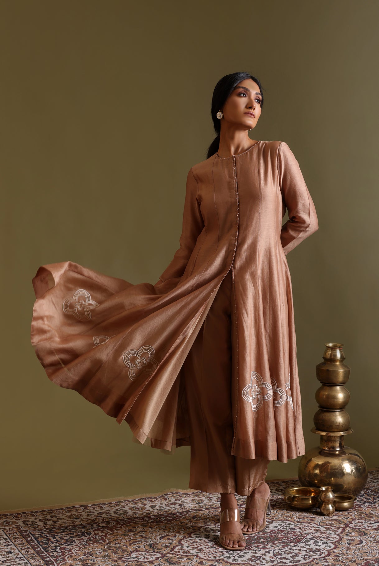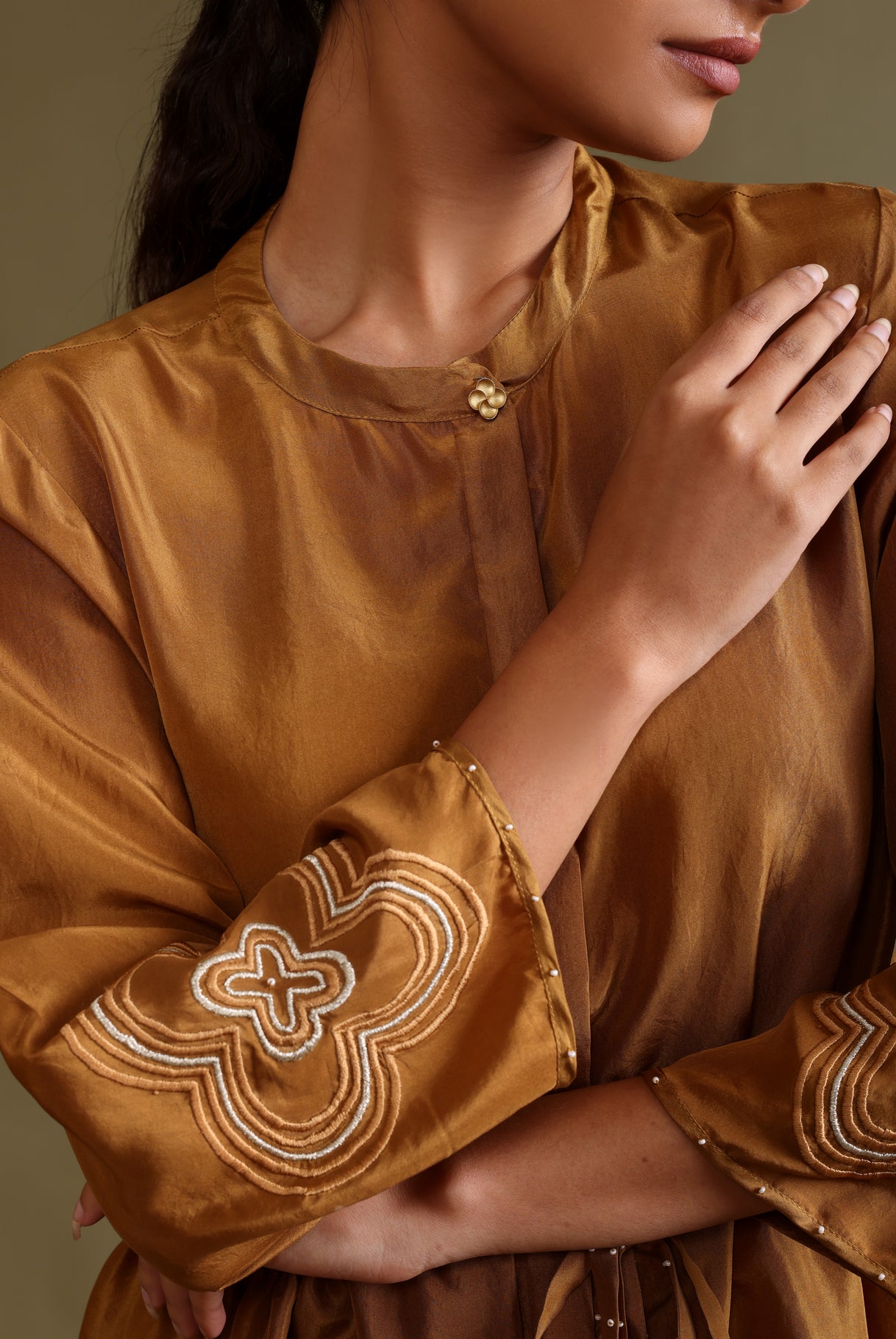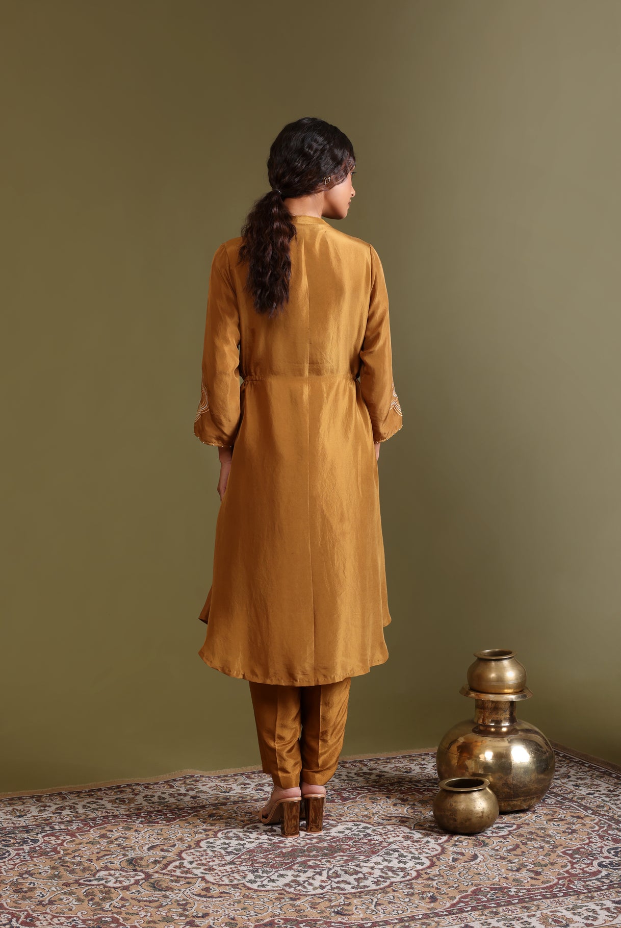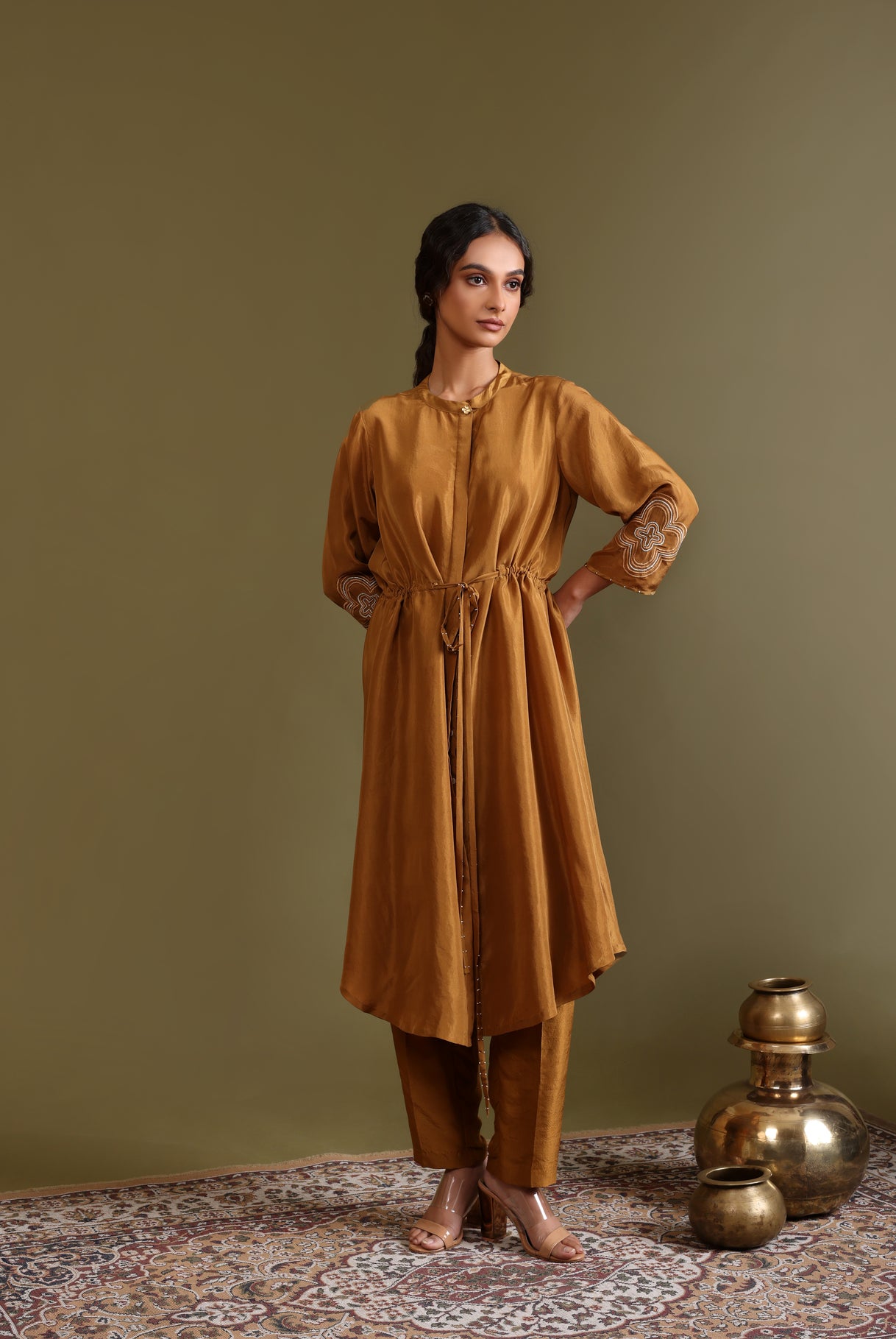Straight-fit kurta with pants, detailed with zari embroidery framing a sleek rectangular silhouette. Comes with an attached lining.