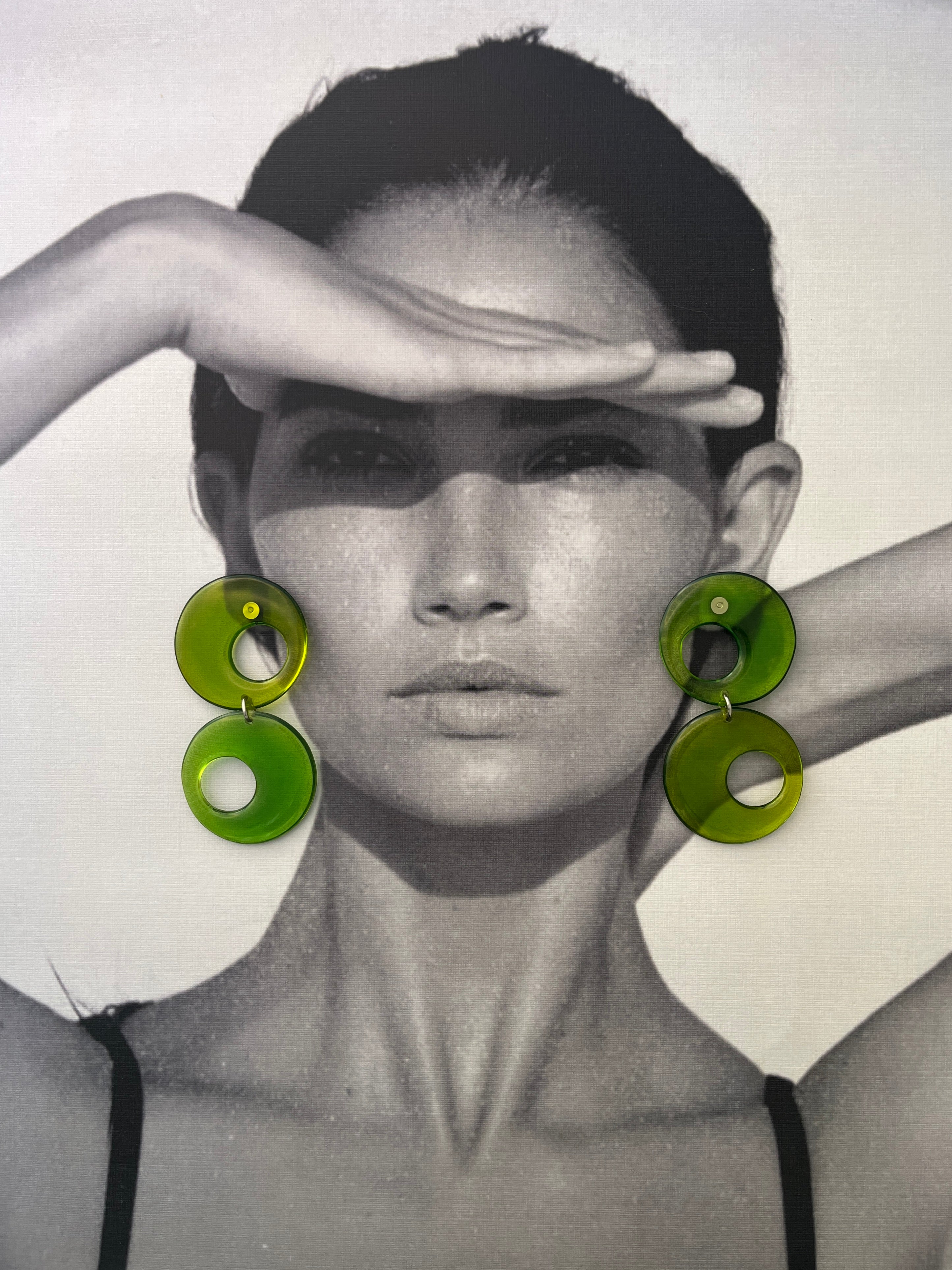This resin annalus in green color captures the essence of 1960s elegance with its thoughtfully designed dangling silhouette and accompanying smaller annalus detail. Constructed from durable resin, the piece showcases the geometric precision and refined simplicity that defined mid-century design. The suspended composition creates an understated sense of movement, while the proportional balance reflects the era's commitment to sophisticated minimalism.