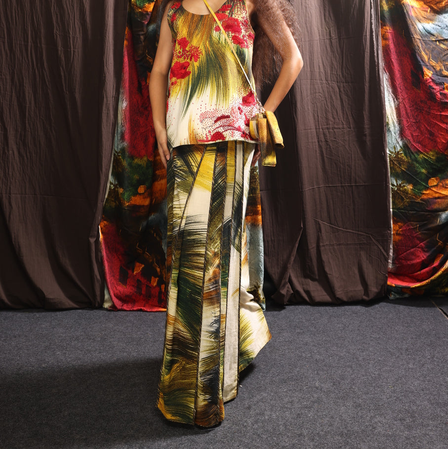 Discover the allure of our Green Firefly saree, meticulously crafted from silk. Featuring hand-painted, digitally printed green firefly motifs, this saree is elegantly adorned with contrast piping details throughout. It includes a matching bralette blouse in the same print, finished with piping for a seamlessly coordinated look.