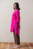 Experience refined tradition with the Gulabi Saaz Set, featuring a vibrant Utsav Pink kurta crafted from soft silk-cotton for comfortable elegance. Intricate gold and silver floral butis enrich the kurta with a subtle festive glow. Complemented by Kasav Brown straight pants highlighted with delicate gold and silver motifs, this ensemble effortlessly marries classic craftsmanship with modern style, ideal for cultural celebrations or discerning everyday wear.