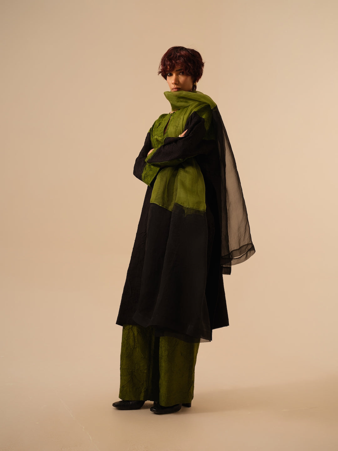 A lightweight dupatta crafted in sheer organza, featuring bold color blocking that adds depth and contrast. The translucent fabric drapes gracefully, offering a modern interpretation of a classic accessory. Designed to pair effortlessly with both structured and fluid silhouettes.