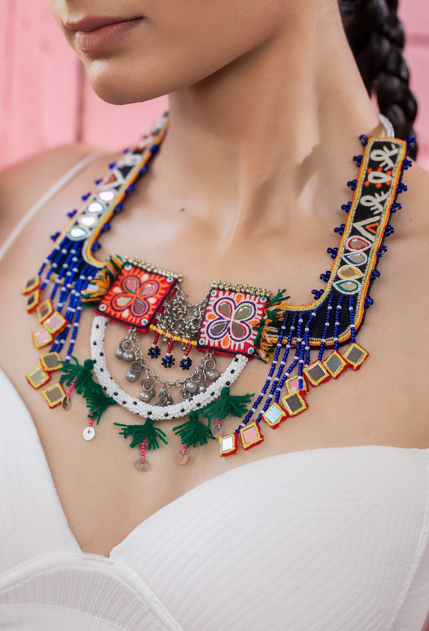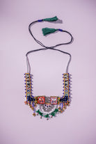 Add elegance and culture to your collection with this expertly crafted neckpiece. Featuring traditional motifs embellished with sparkling mirrors and metal hangings, it has a rustic yet sophisticated "Hansdi" look. Perfect for bold, unique style statements, this lightweight piece is designed for effortless wear with a secure hook closure. Elevate any outfit and feel empowered with this one-of-a-kind design.